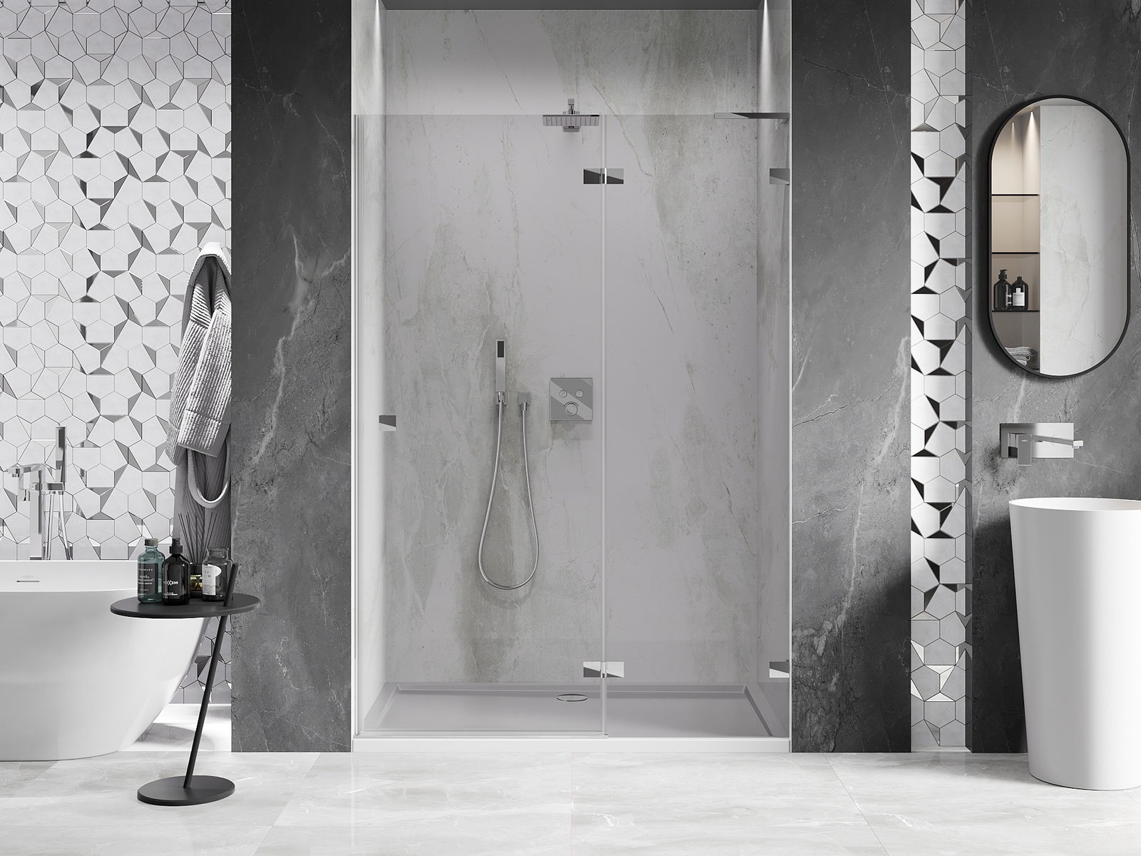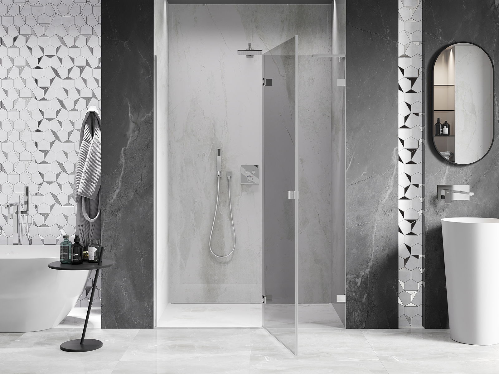 Скобите и пантите са изработени от много издръжлив месинг и създават плосък стъклен панел. Това е отличен избор, който съчетава елегантност, издръжливост и модерен дизайн. Благодарение на такива решения, душът придобива естетика и същевременно улеснява поддържането на чистота.