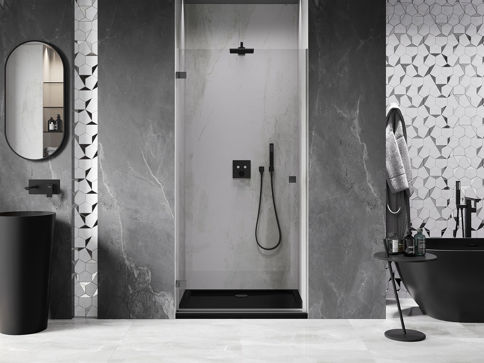 Удобната и практична дръжка е изработена от здрав и устойчив метал. Модерната форма в съчетание с покритието, съответстващо на цвета на профилите, придава на цялото модерен и стилен вид, подчертавайки естетиката на всяка баня.