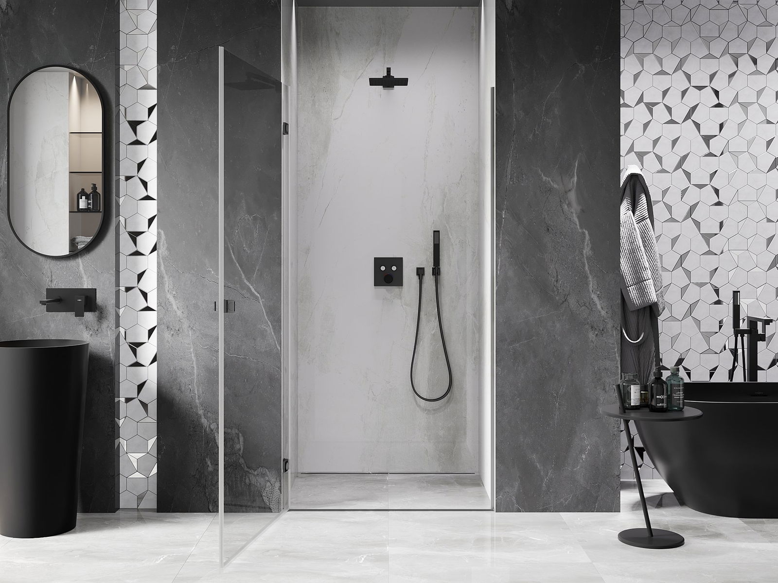 Удобната и практична дръжка е изработена от здрав и устойчив метал. Модерната форма в съчетание с покритието, съответстващо на цвета на профилите, придава на цялото модерен и стилен вид, подчертавайки естетиката на всяка баня.