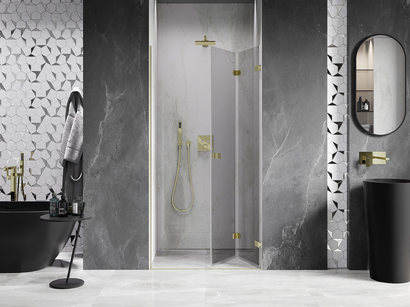 Mexen Lunar-F сгъваеми душ врати десни 85 см, прозрачни, златисто четкани - 836-085-000-55-00-P