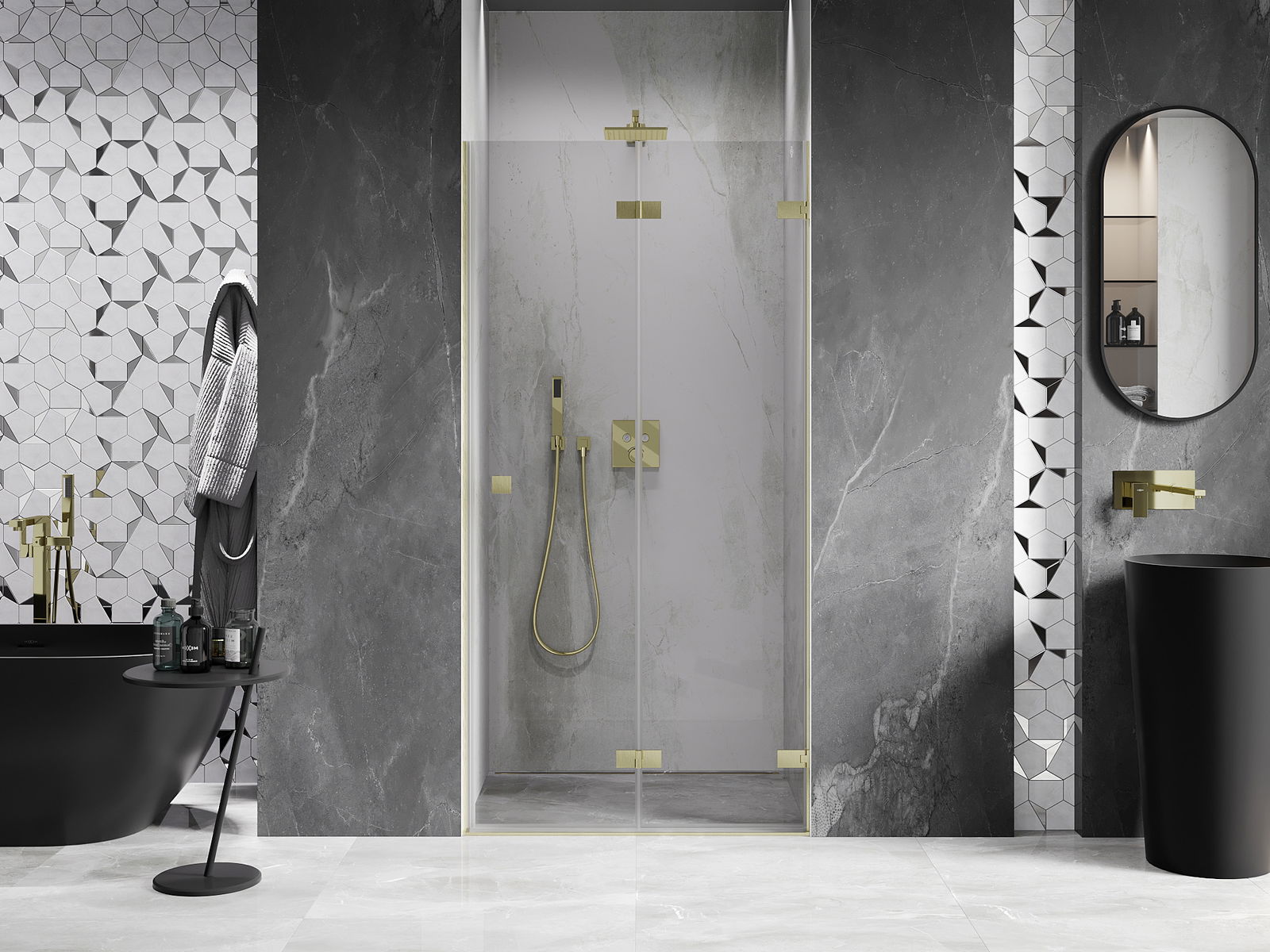 Mexen Lunar-F сгъваеми десни душ врати 90 см, прозрачни, златни четки - 836-090-000-55-00-P