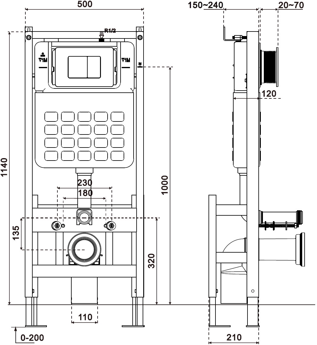 Mexen Tex Air F е самостоятелна вградена стойка с функция за пневматично промиване. Благодарение на височината от 114 см, широчината 50 см и дебелината 12 см, тя е идеална за монтаж в плътни стени и гипсокартон. Офертира съвместимост с висящи тоалетни с разстояние между отворите 18 см или 23 см. Разполага с регулируеми, поцинковани крака и подпори, което улеснява монтажа на подложки с дебелина 0-20 см. Резервоарът с изолация против конденз гарантира дълготрайност, а регулирането на количеството изразходвана вода (6/9 L, 4,5/3 L) осигурява спестявания. Идеална за комплектоване с бутони Mexen от серията Tex.