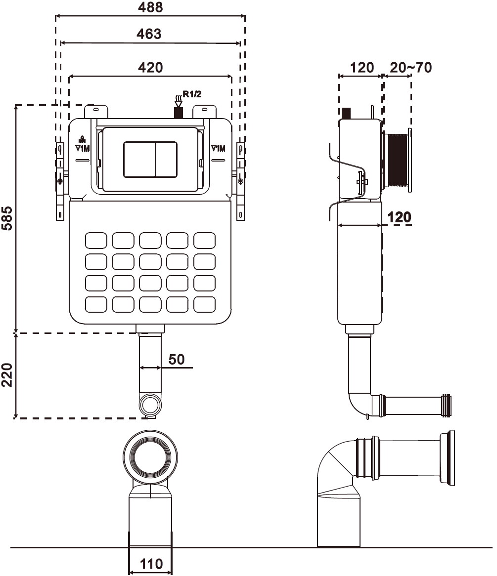 Mexen Tex Air S е пневматичен вграден модул за стояща тоалетна, който се отличава с универсалност благодарение на възможноста за монтаж в пълна стена или със гипсокартон. Характеризира се с компактни размери: височина 79 см, ширина 48 см и дебелина 12 см, което улеснява инсталацията. Пневматичният механизъм за изплакване и възможността за регулиране на количестовото промивна вода (3/6 L, 4/7 L, 4,5/9 L) увеличават комфорта на употреба. Поцинкованите подпори и резервоар с изолация против конденз гарантират дълготрайност. Стелажът Mexen Tex Air S работи отлично с бутоните от серията Tex.