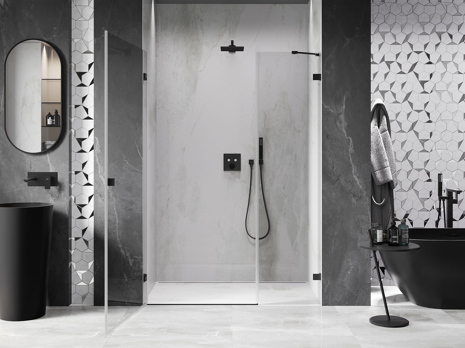 Удобната и практична дръжка е изработена от здрав и устойчив метал. Модерната форма в съчетание с покритието, съответстващо на цвета на профилите, придава на цялото модерен и стилен вид, подчертавайки естетиката на всяка баня.