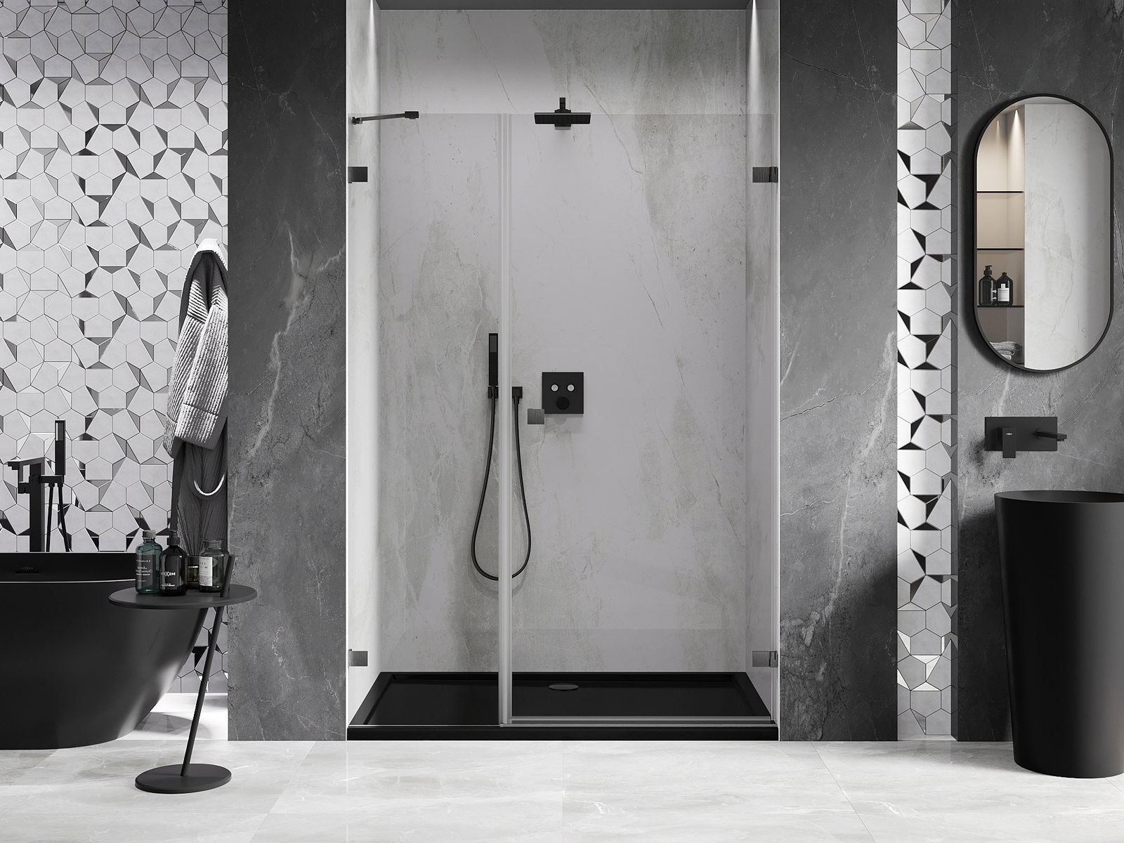 Удобната и практична дръжка е изработена от здрав и устойчив метал. Модерната форма в съчетание с покритието, съответстващо на цвета на профилите, придава на цялото модерен и стилен вид, подчертавайки естетиката на всяка баня.