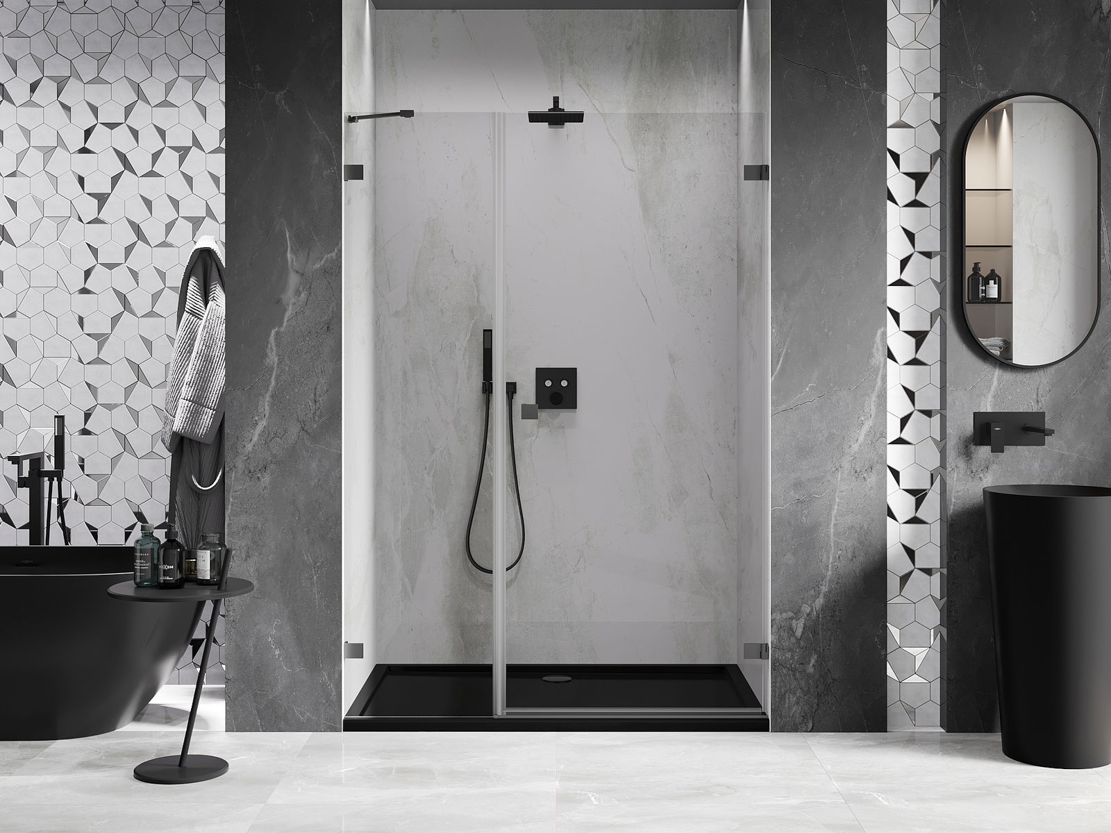 Завършек: Профил: Алуминиев Вид стъкло: Закалено Дебелина на стъклото: врати 6 мм, стена 8 мм Покритие, улесняващо почистването Възможност за регулиране на широчината Два системи за монтаж: - С профил, който позволява корекция на неравностите на стената - Без профил за перфектно прави стени Възможност за монтаж на корито или плочки Механизъм за повдигане и снижаване на вратите Месингови дръжки, вградени с повърхността на стъклото Магнитна лента и еластомерни уплътнения за водоотвеждане Алуминиев праг за уплътняване на вратата