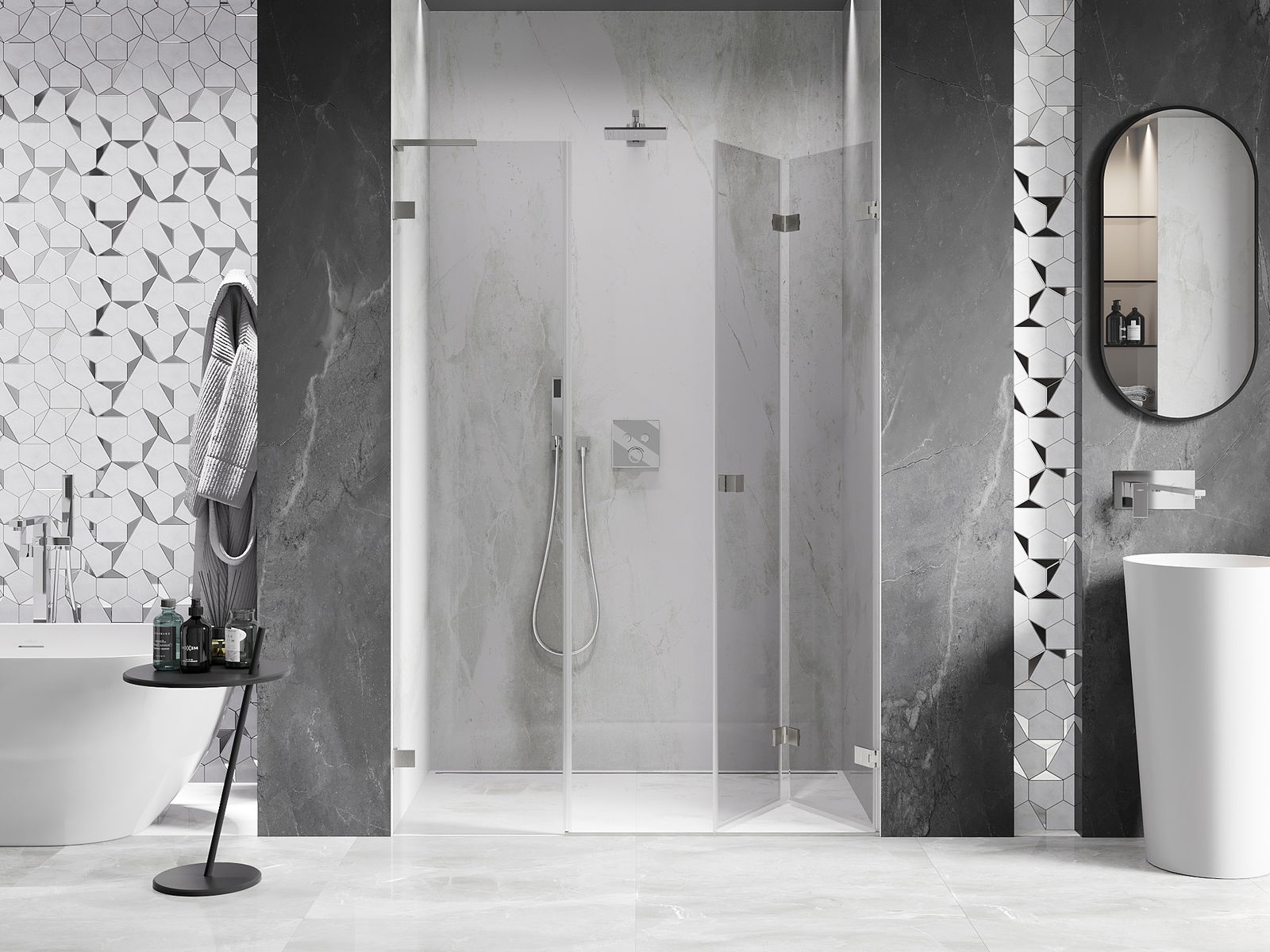 Възможността за сгъване на вратите, както навън, така и навътре, позволява да се осигури повече пространство, когато душът не се използва. Това е идеалното решение за по-малки бани, максимално използвайки наличната площ.