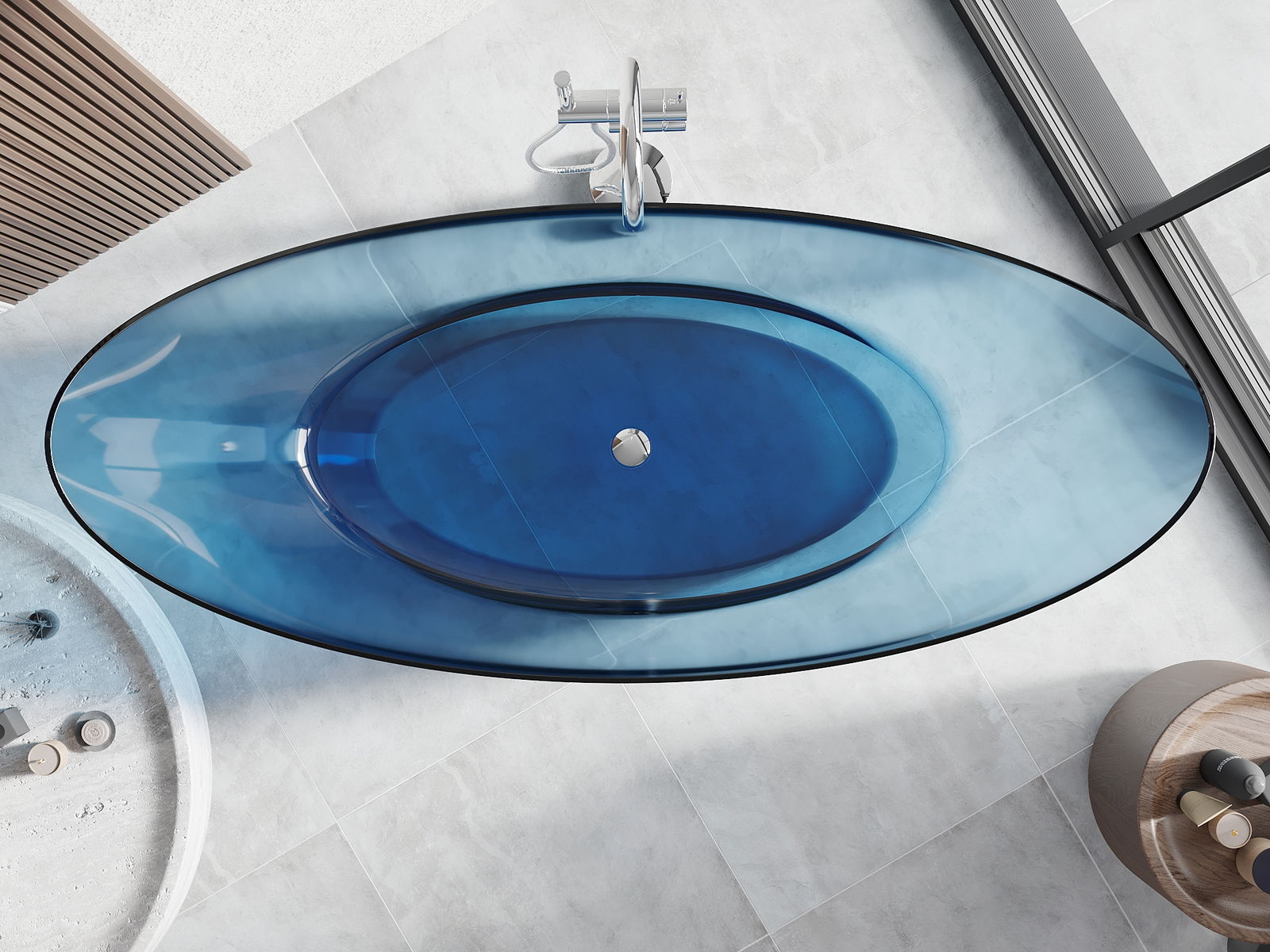 Това е модерен материал, който съчетава елегантен вид с висока издръжливост. Устойчив е на механични повреди, лесен за почистване и приятен на допир. Прозрачната форма и тънкият ръб на ваната ѝ придават лекота и уникален характер, създавайки ефектен акцент в подредбата на банята.
