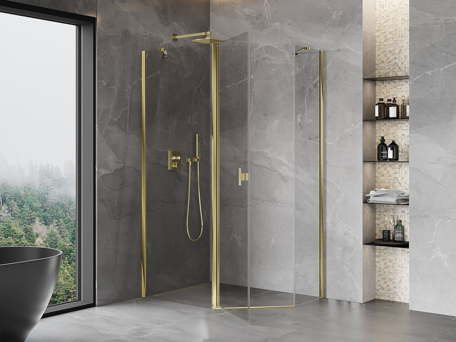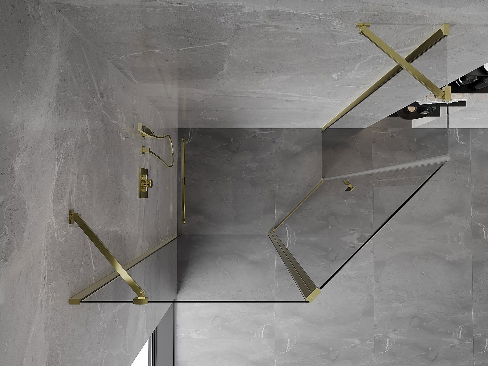Mexen Mist асиметрична петстенна душ кабина с въртяща врата 100 x 80 см, прозрачна, златна - 8A8-100-080-50-00