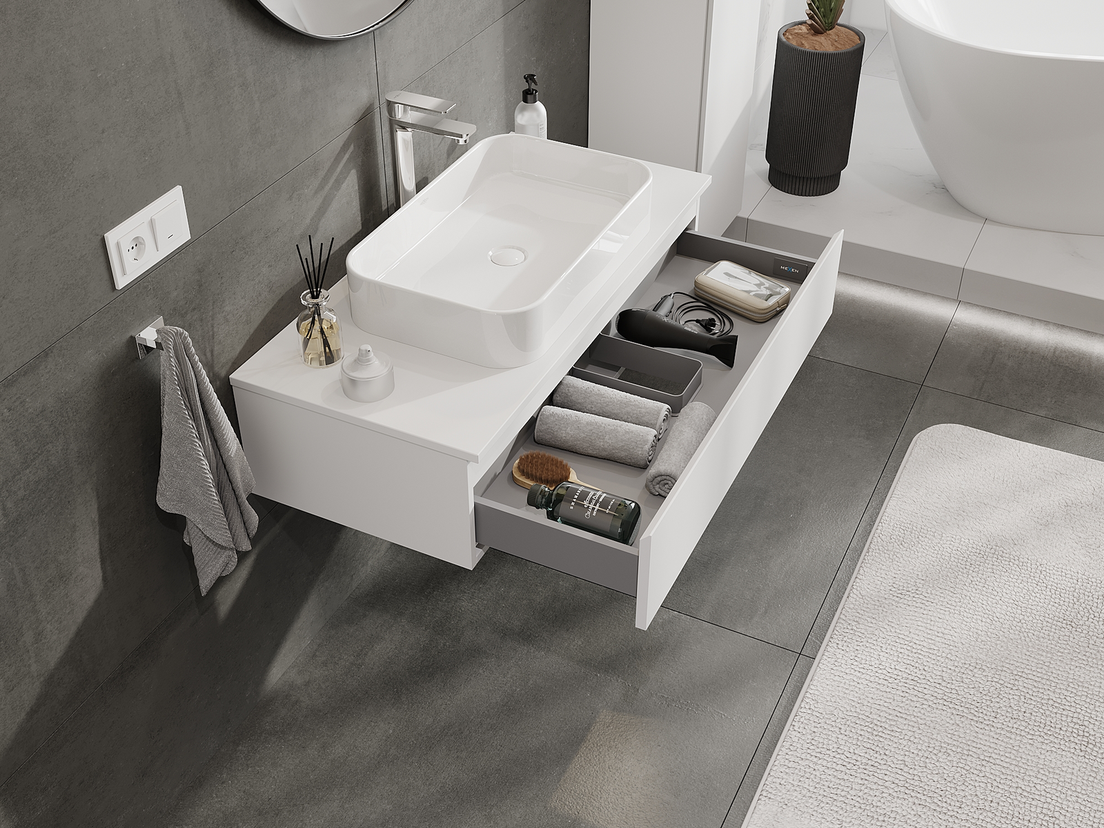 Изрезът в чекмеджето е проектиран по такъв начин, че да побере сифона, който е необходим в мивковите инсталации. Благодарение на това мебелът може да бъде монтиран напълно функционално, без да се налага отказване от пространството в чекмеджето заради инсталацията.