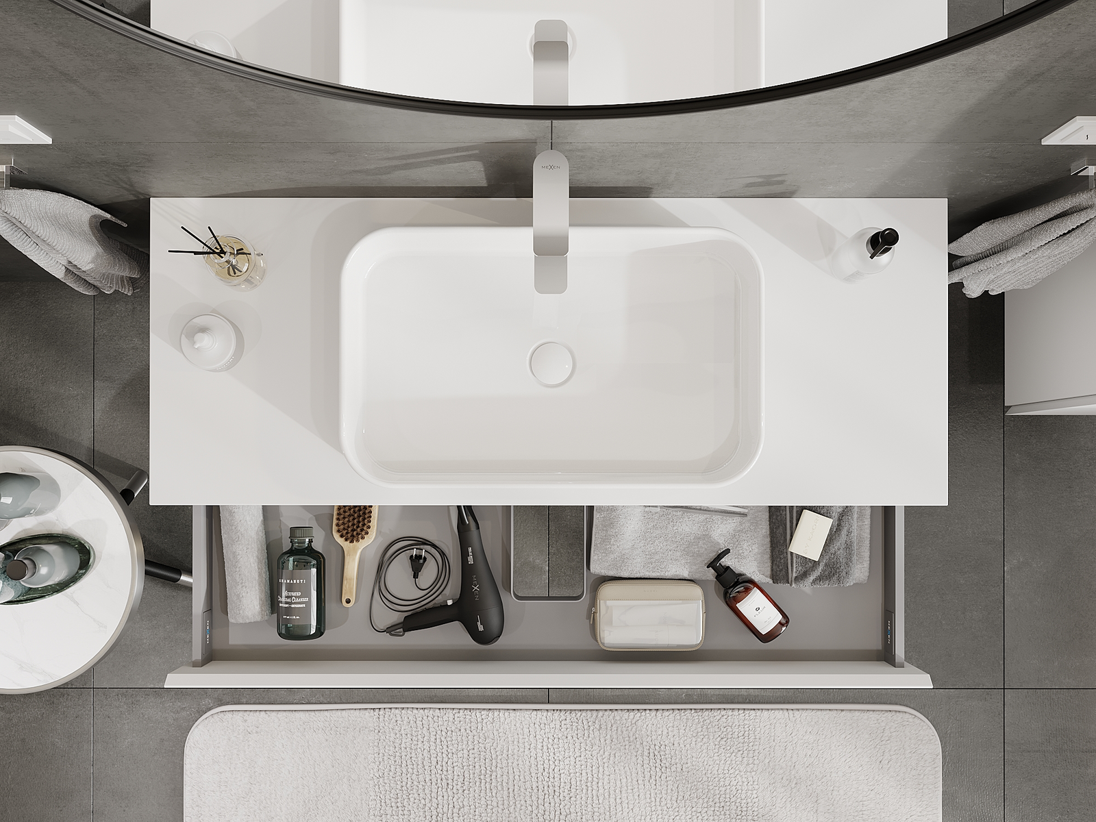 Изрезът в чекмеджето е проектиран по такъв начин, че да побере сифона, който е необходим в мивковите инсталации. Благодарение на това мебелът може да бъде монтиран напълно функционално, без да се налага отказване от пространството в чекмеджето заради инсталацията.