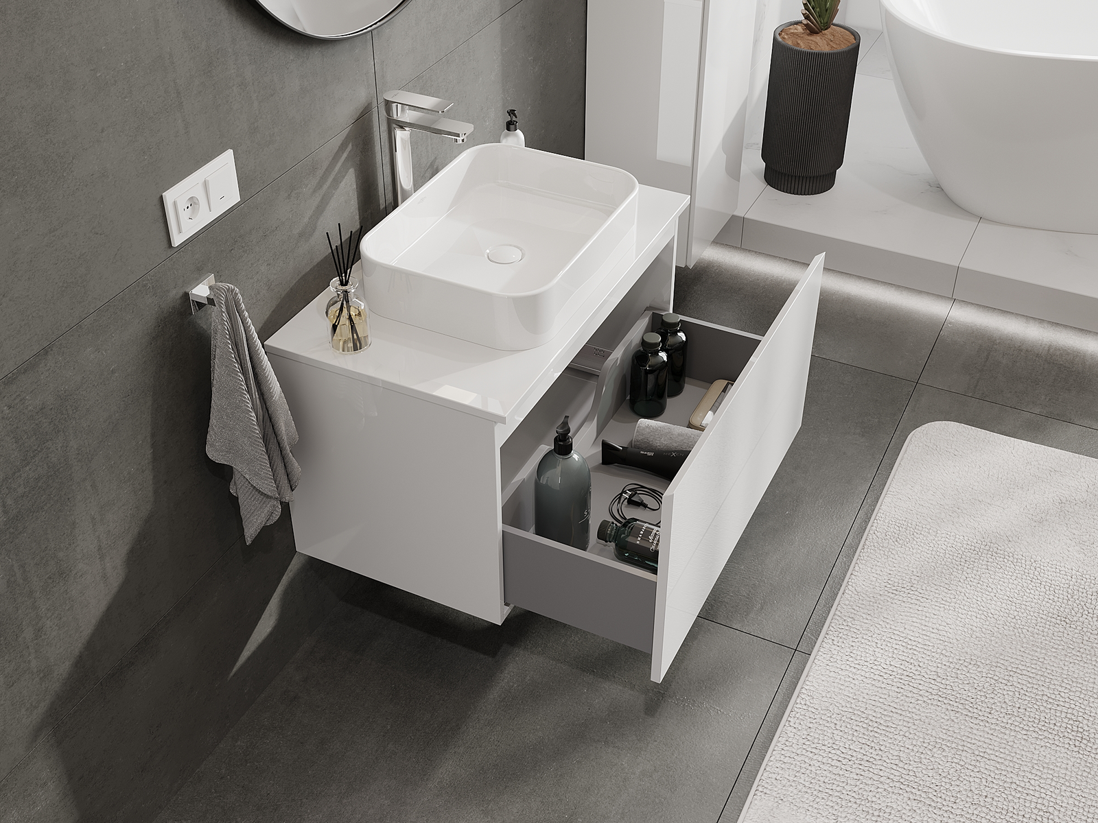 Нашите модулни мебели за баня могат да се комбинират в различни цветови конфигурации, което позволява пълна персонализация. Може да се избере както външният вид, така и функциите на отделните елементи, което позволява съчетаване на мебелите със собствените стилови и функционални предпочитания.