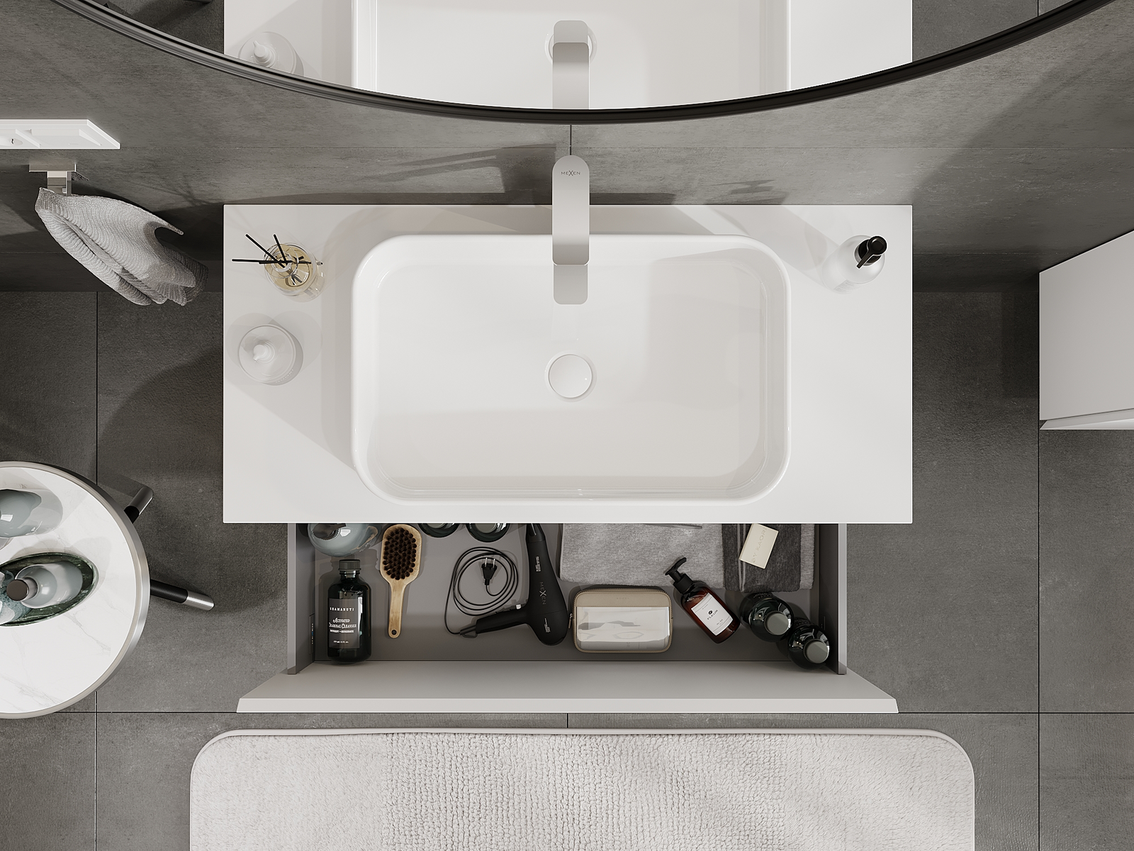 Изрезът в чекмеджето е проектиран по такъв начин, че да побере сифона, който е необходим в мивковите инсталации. Благодарение на това мебелът може да бъде монтиран напълно функционално, без да се налага отказване от пространството в чекмеджето заради инсталацията.