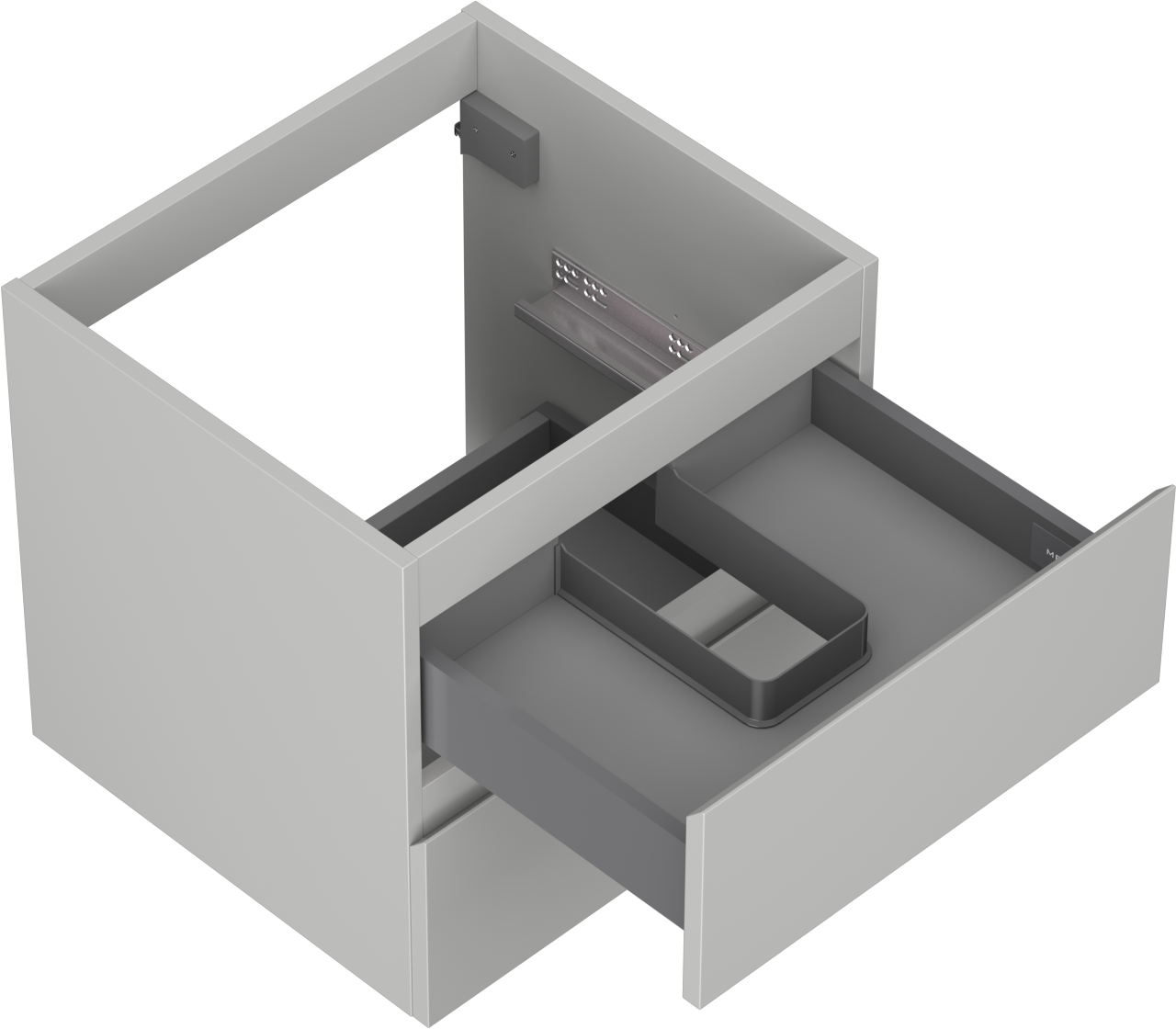 Изрезът в чекмеджето е проектиран по такъв начин, че да побере сифона, който е необходим в мивковите инсталации. Благодарение на това мебелът може да бъде монтиран напълно функционално, без да се налага отказване от пространството в чекмеджето заради инсталацията.