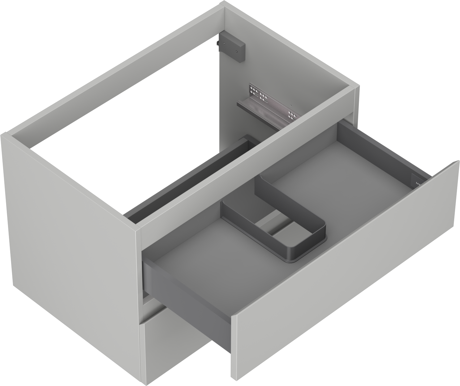 Изрезът в чекмеджето е проектиран по такъв начин, че да побере сифона, който е необходим в мивковите инсталации. Благодарение на това мебелът може да бъде монтиран напълно функционално, без да се налага отказване от пространството в чекмеджето заради инсталацията.
