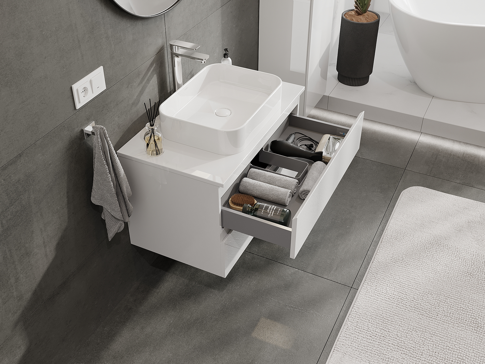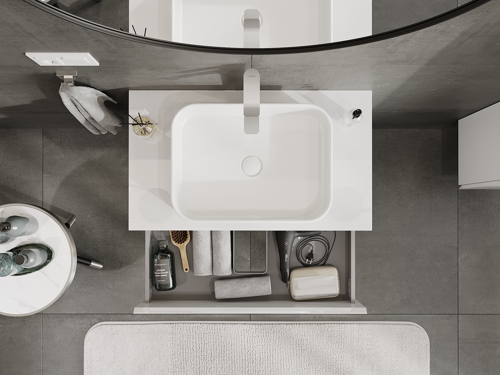 Изрезът в чекмеджето е проектиран по такъв начин, че да побере сифона, който е необходим в мивковите инсталации. Благодарение на това мебелът може да бъде монтиран напълно функционално, без да се налага отказване от пространството в чекмеджето заради инсталацията.