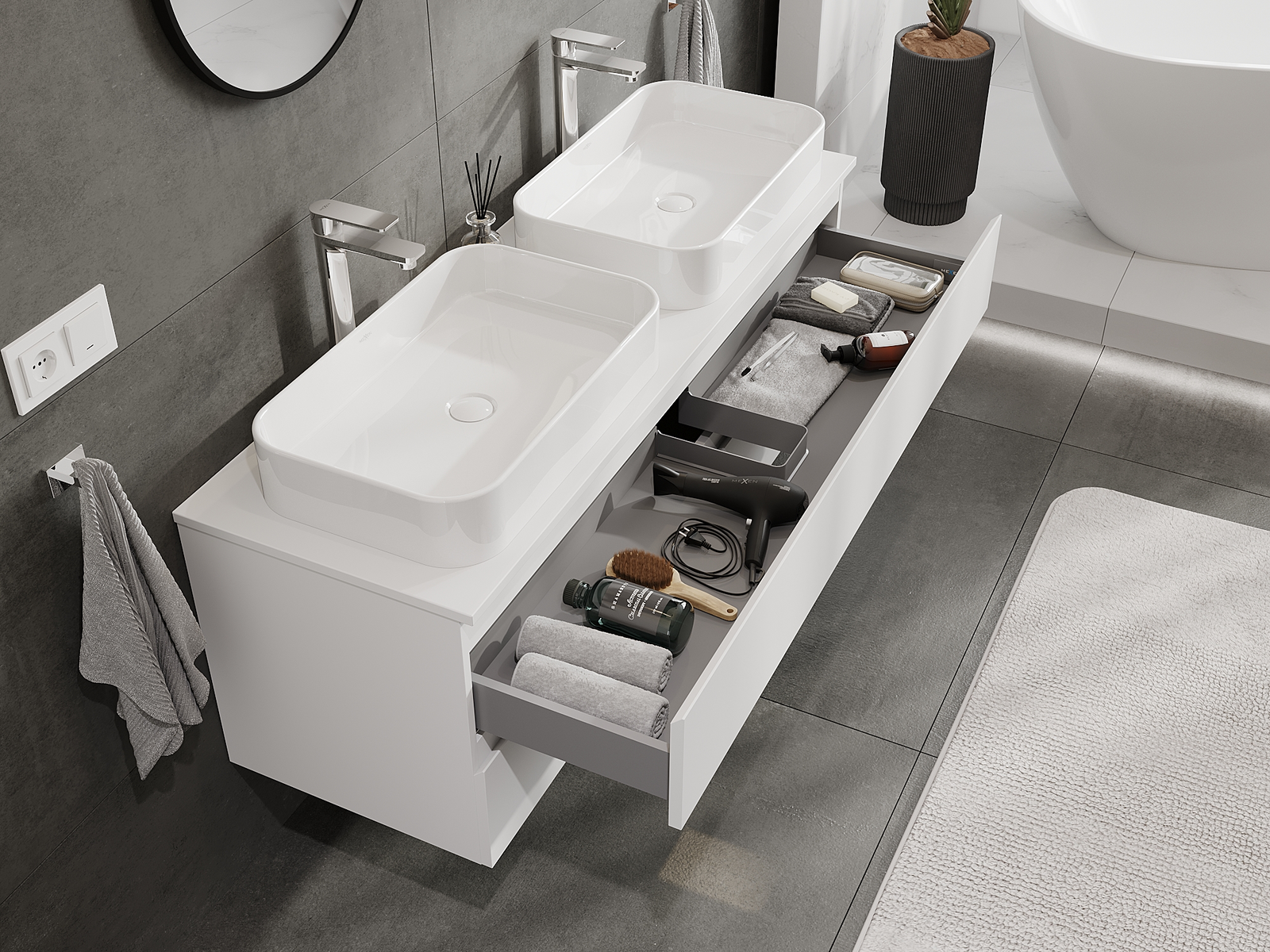 Нашите модулни мебели за баня могат да се комбинират в различни цветови конфигурации, което позволява пълна персонализация. Може да се избере както външният вид, така и функциите на отделните елементи, което позволява съчетаване на мебелите със собствените стилови и функционални предпочитания.