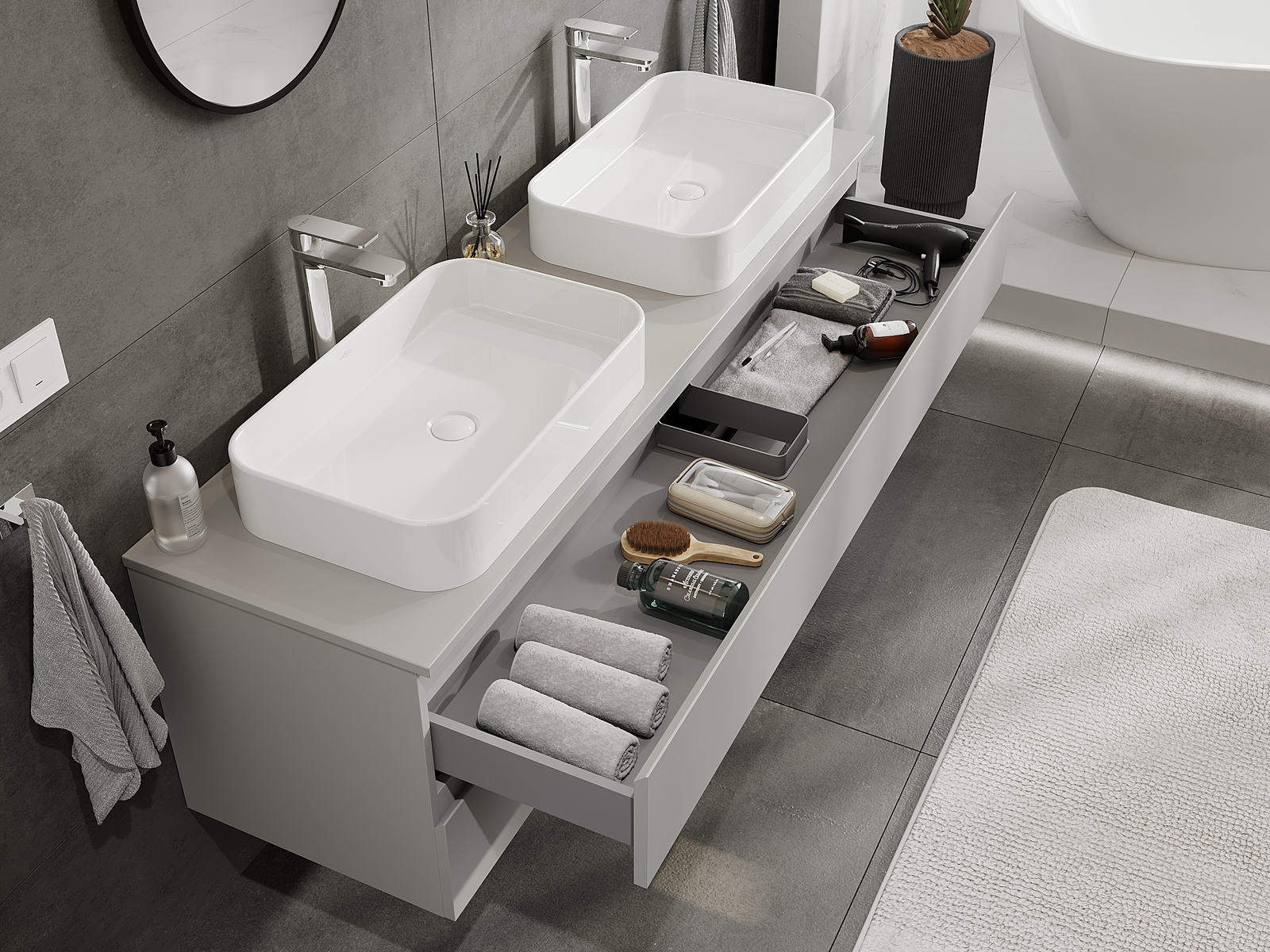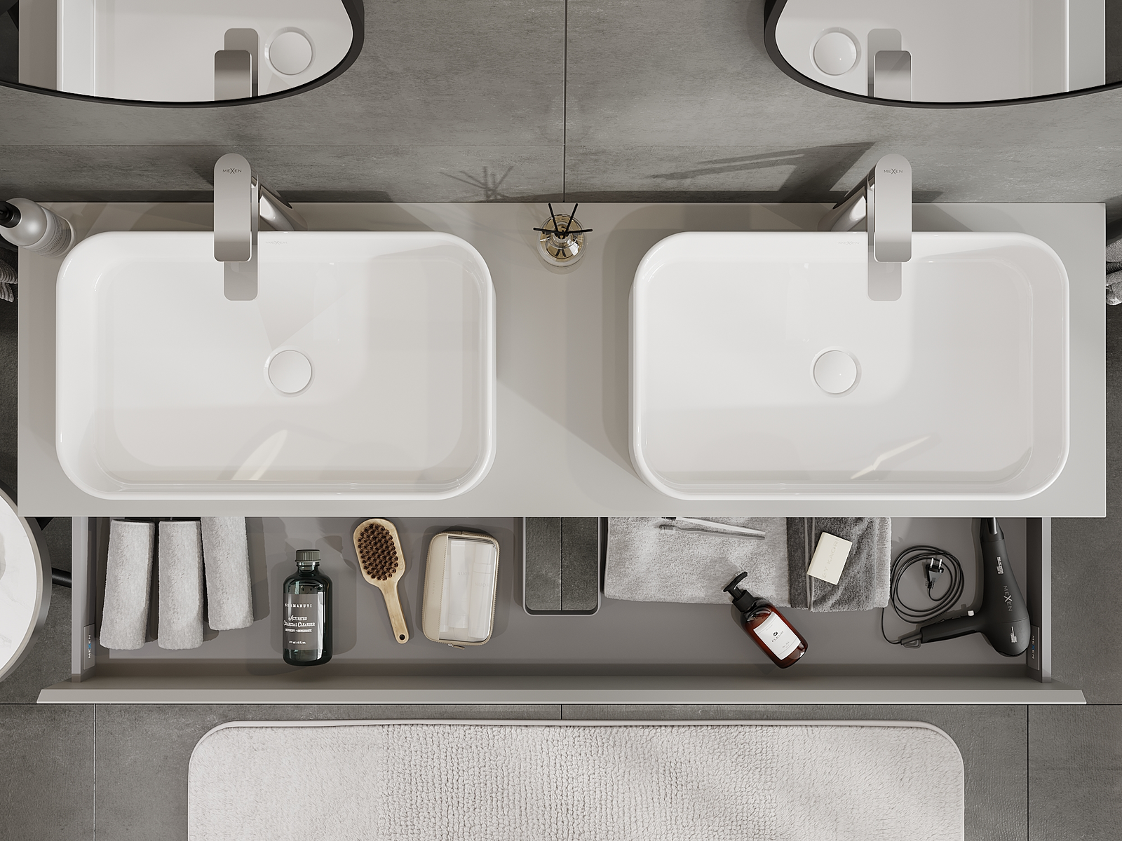 Нашите модулни мебели за баня могат да се комбинират в различни цветови конфигурации, което позволява пълна персонализация. Може да се избере както външният вид, така и функциите на отделните елементи, което позволява съчетаване на мебелите със собствените стилови и функционални предпочитания.