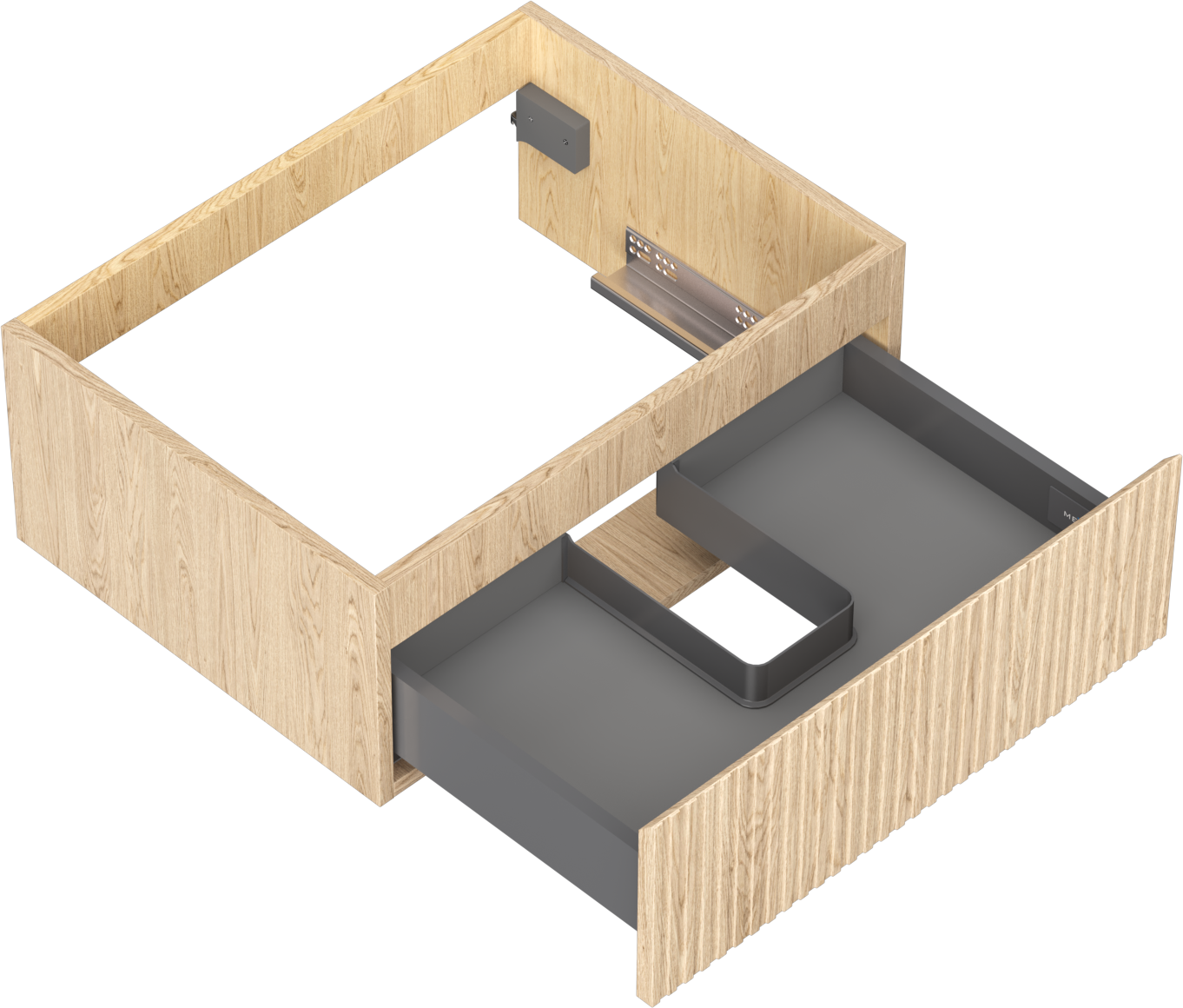Изрезът в чекмеджето е проектиран по такъв начин, че да побере сифона, който е необходим в мивковите инсталации. Благодарение на това мебелът може да бъде монтиран напълно функционално, без да се налага отказване от пространството в чекмеджето заради инсталацията.