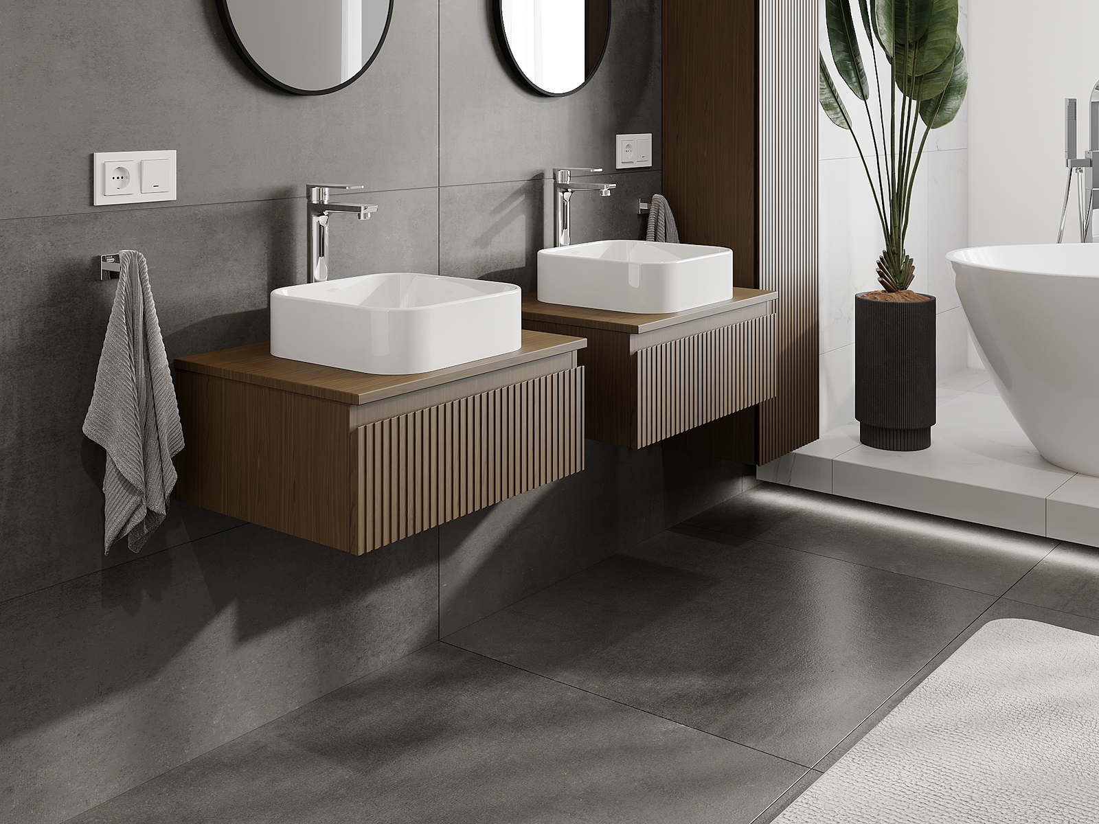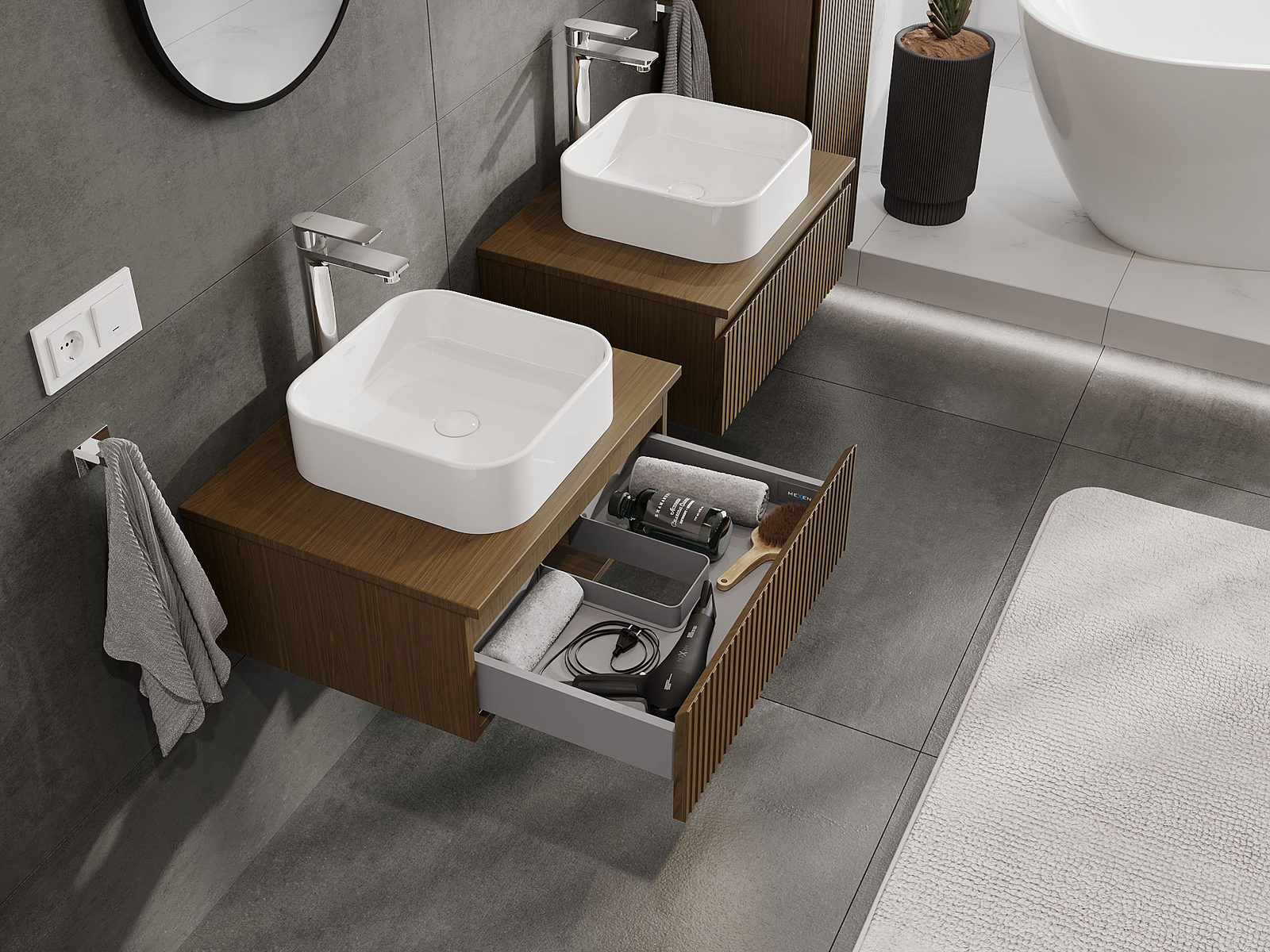 Нашите модулни мебели за баня могат да се комбинират в различни цветови конфигурации, което позволява пълна персонализация. Може да се избере както външният вид, така и функциите на отделните елементи, което позволява съчетаване на мебелите със собствените стилови и функционални предпочитания.