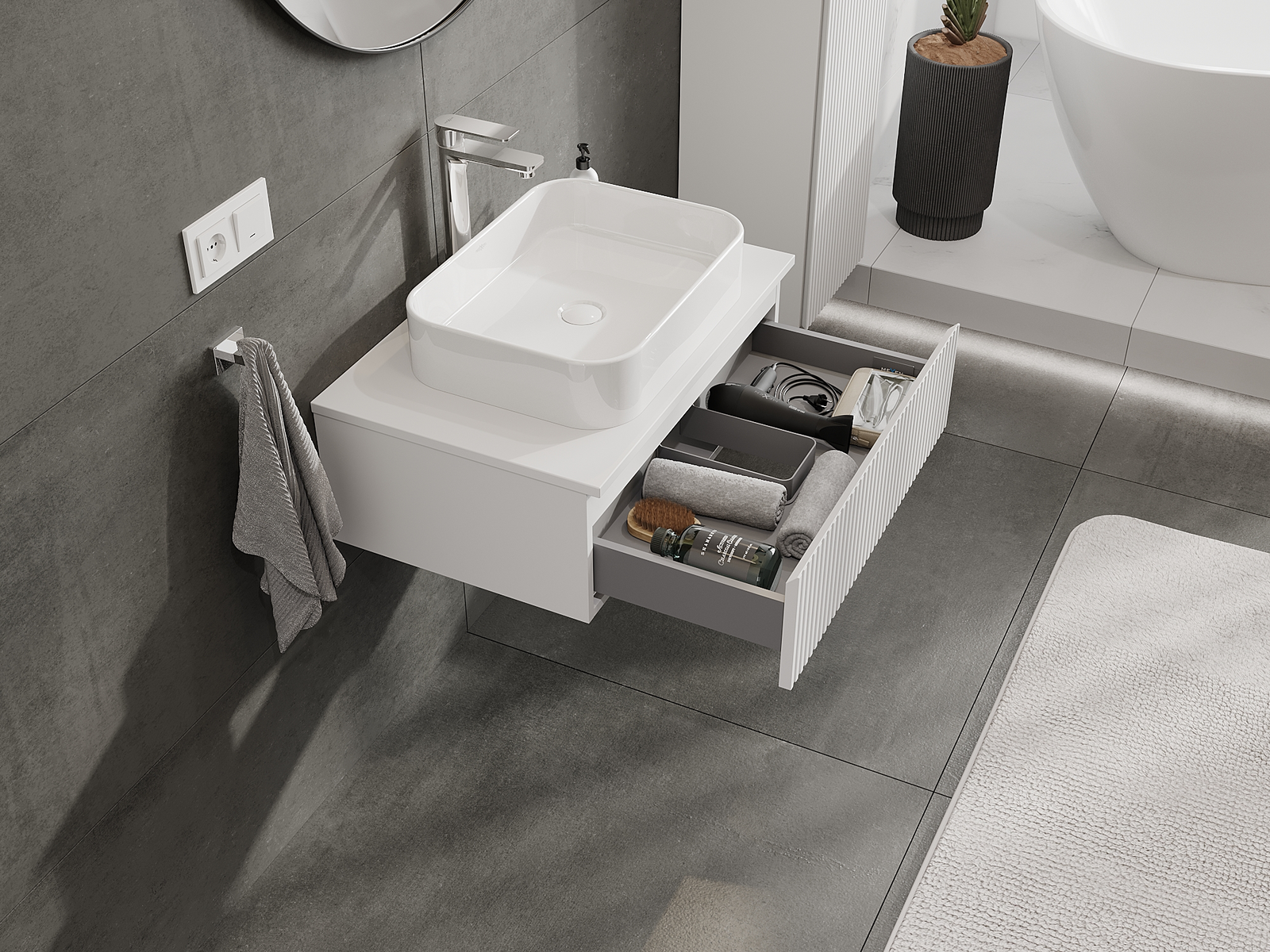 Изрезът в чекмеджето е проектиран по такъв начин, че да побере сифона, който е необходим в мивковите инсталации. Благодарение на това мебелът може да бъде монтиран напълно функционално, без да се налага отказване от пространството в чекмеджето заради инсталацията.