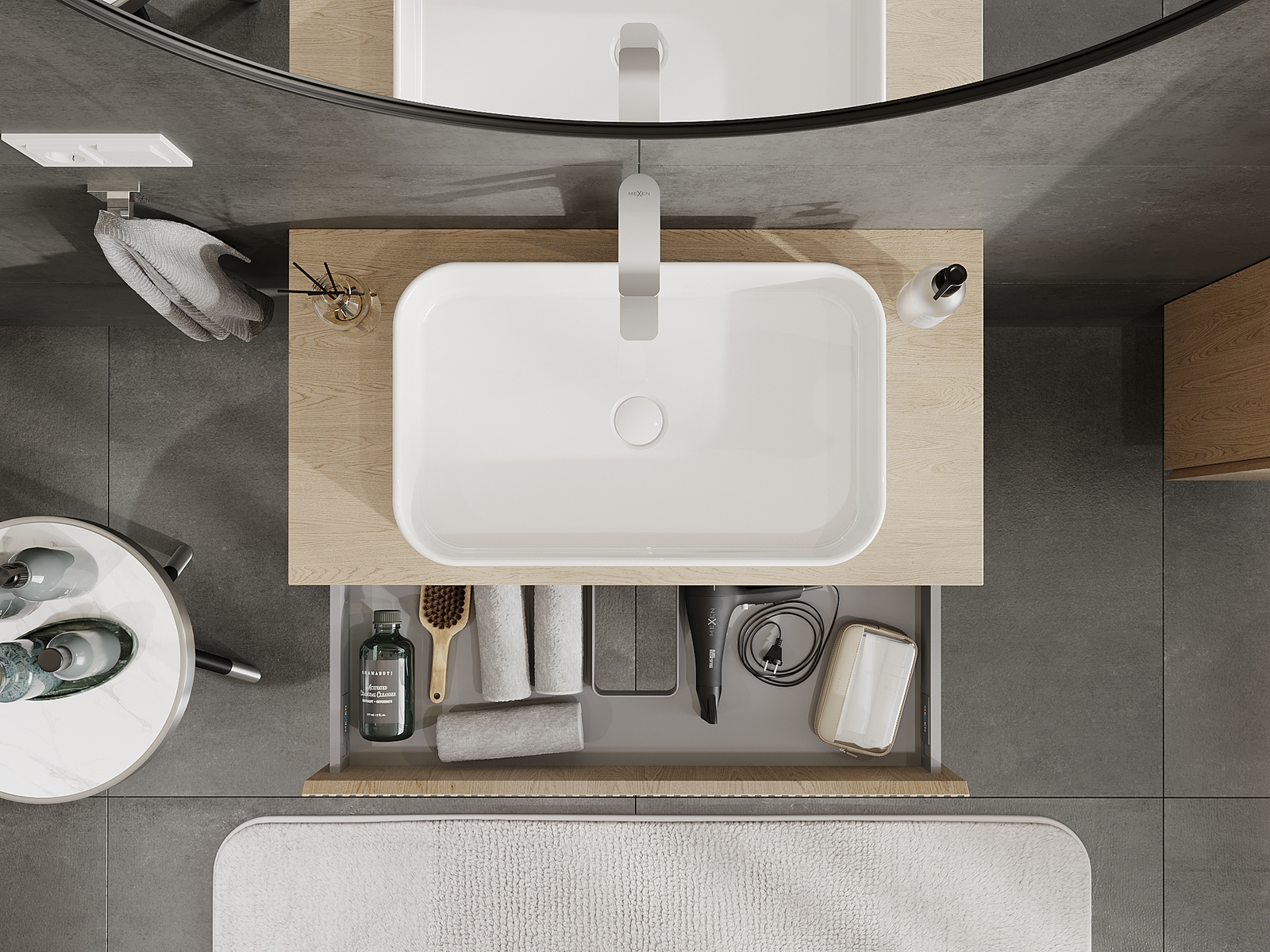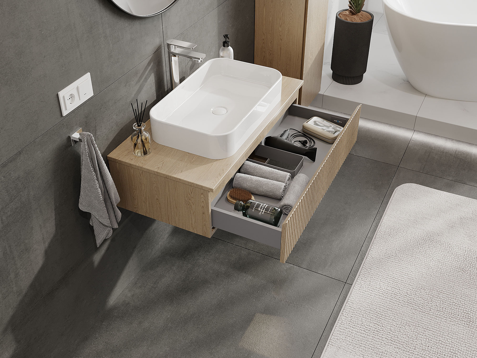 Изрезът в чекмеджето е проектиран по такъв начин, че да побере сифона, който е необходим в мивковите инсталации. Благодарение на това мебелът може да бъде монтиран напълно функционално, без да се налага отказване от пространството в чекмеджето заради инсталацията.