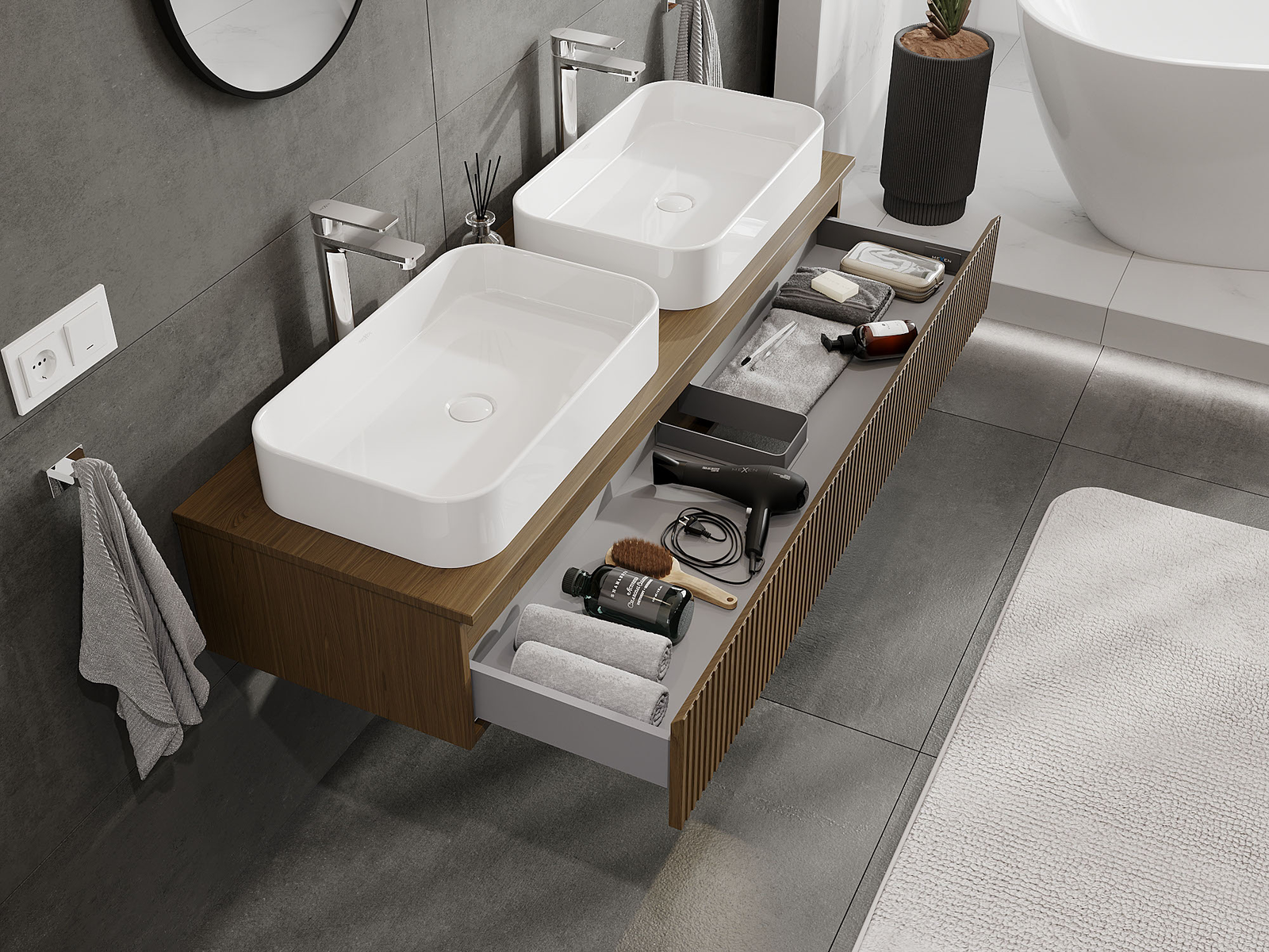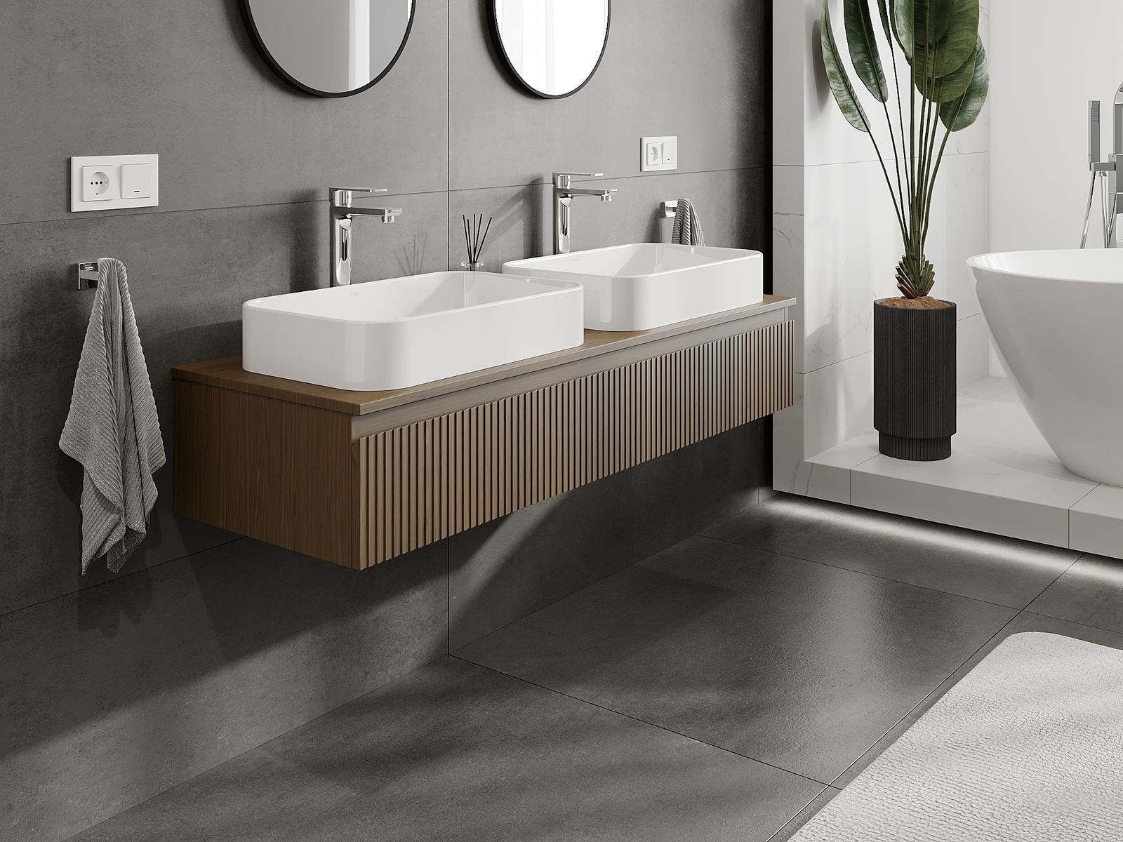 Нашите модулни мебели за баня могат да се комбинират в различни цветови конфигурации, което позволява пълна персонализация. Може да се избере както външният вид, така и функциите на отделните елементи, което позволява съчетаване на мебелите със собствените стилови и функционални предпочитания.