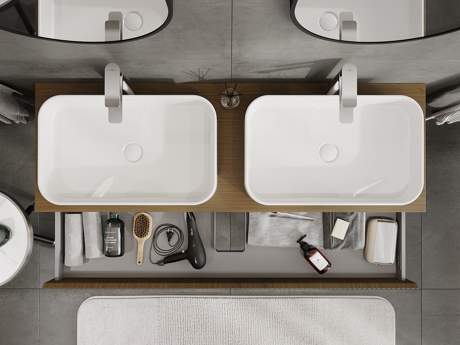 Изрезът в чекмеджето е проектиран по такъв начин, че да побере сифона, който е необходим в мивковите инсталации. Благодарение на това мебелът може да бъде монтиран напълно функционално, без да се налага отказване от пространството в чекмеджето заради инсталацията.