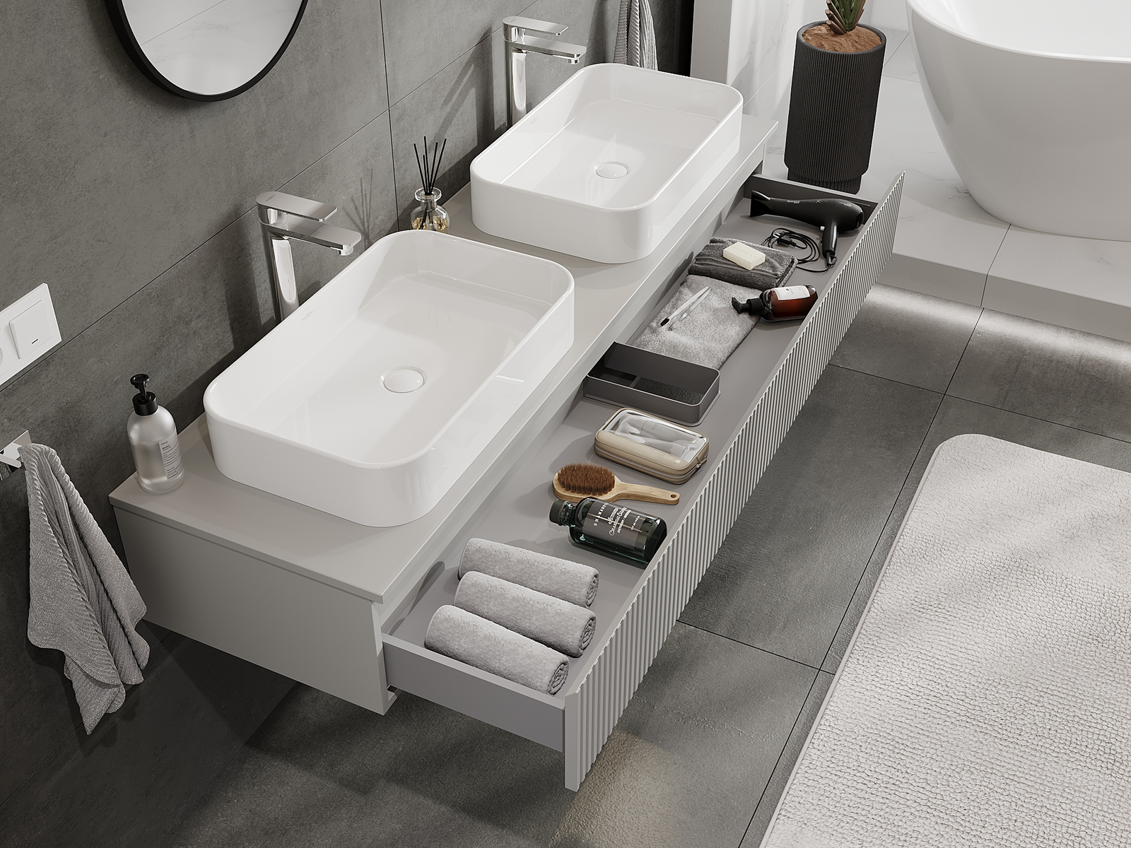 Нашите модулни мебели за баня могат да се комбинират в различни цветови конфигурации, което позволява пълна персонализация. Може да се избере както външният вид, така и функциите на отделните елементи, което позволява съчетаване на мебелите със собствените стилови и функционални предпочитания.