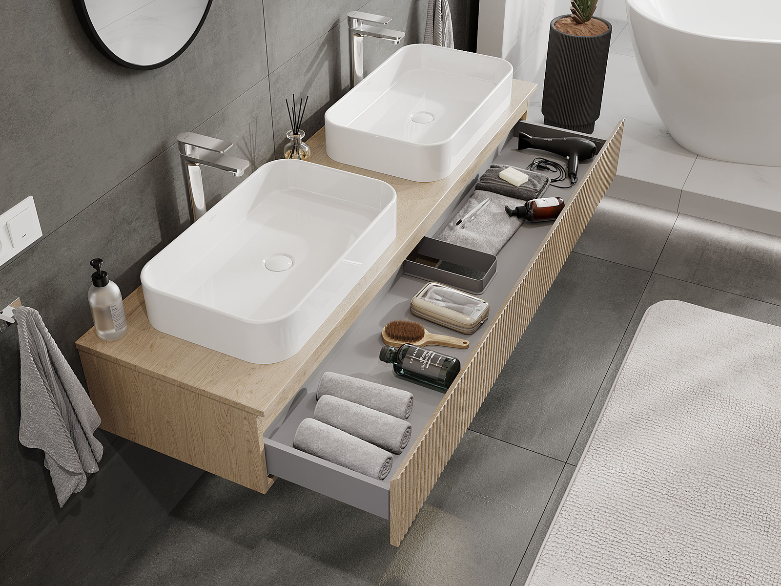 Нашите модулни мебели за баня могат да се комбинират в различни цветови конфигурации, което позволява пълна персонализация. Може да се избере както външният вид, така и функциите на отделните елементи, което позволява съчетаване на мебелите със собствените стилови и функционални предпочитания.