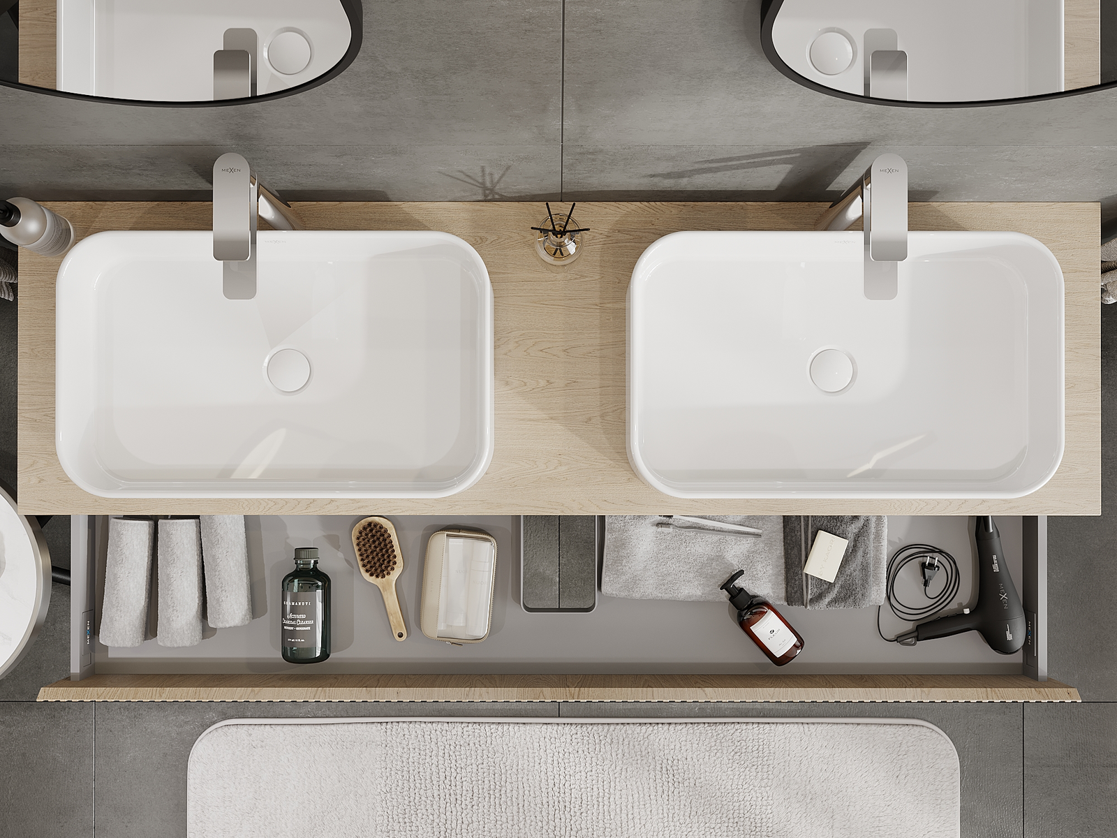 Изрезът в чекмеджето е проектиран по такъв начин, че да побере сифона, който е необходим в мивковите инсталации. Благодарение на това мебелът може да бъде монтиран напълно функционално, без да се налага отказване от пространството в чекмеджето заради инсталацията.