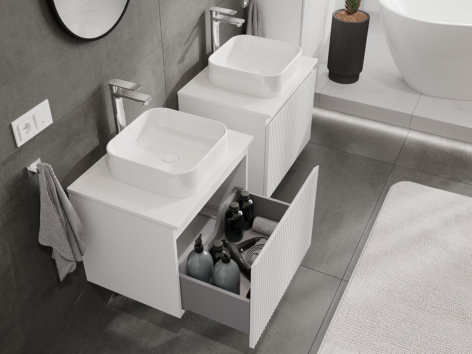 Нашите модулни мебели за баня могат да се комбинират в различни цветови конфигурации, което позволява пълна персонализация. Може да се избере както външният вид, така и функциите на отделните елементи, което позволява съчетаване на мебелите със собствените стилови и функционални предпочитания.
