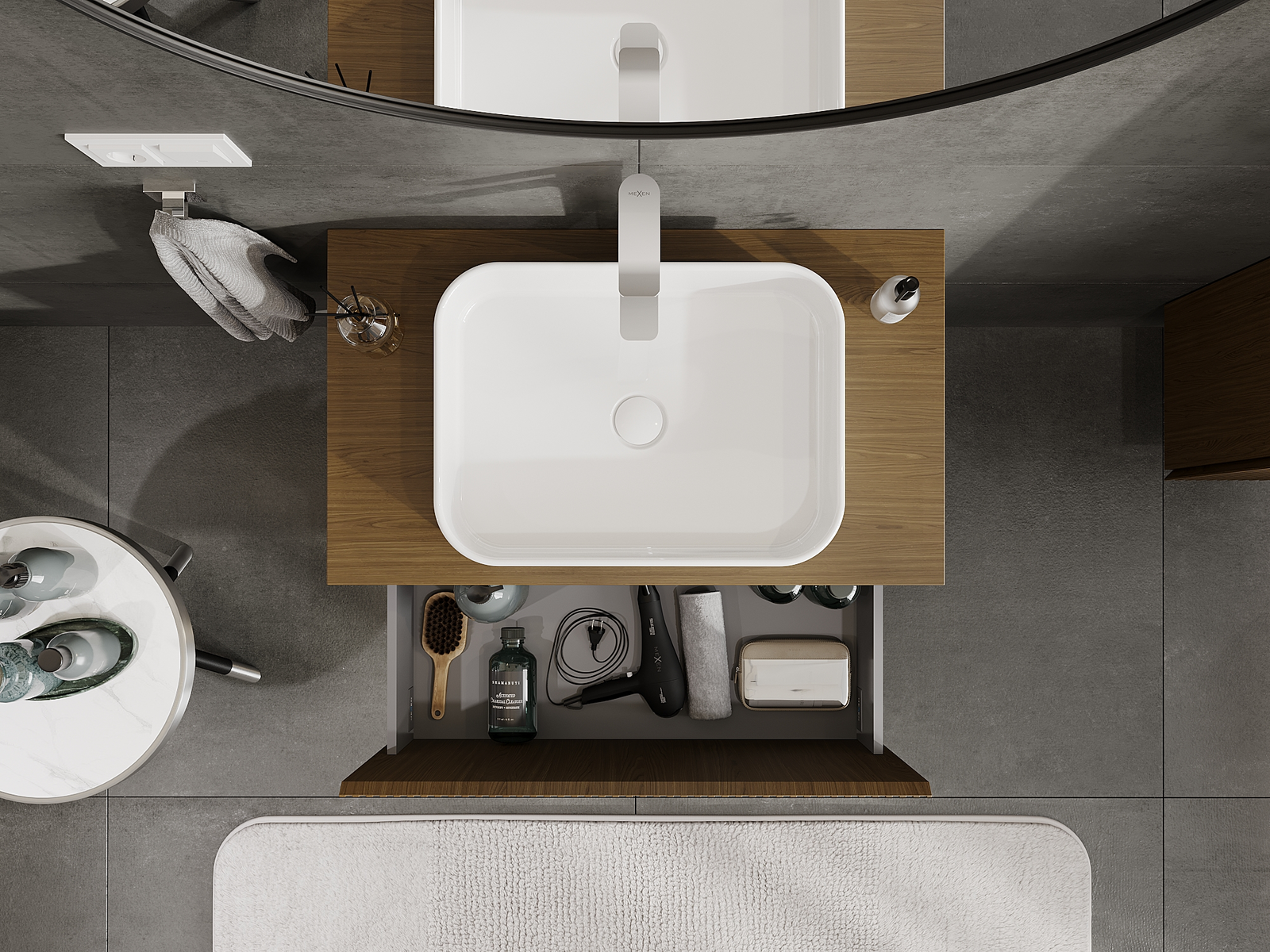 Изрезът в чекмеджето е проектиран по такъв начин, че да побере сифона, който е необходим в мивковите инсталации. Благодарение на това мебелът може да бъде монтиран напълно функционално, без да се налага отказване от пространството в чекмеджето заради инсталацията.