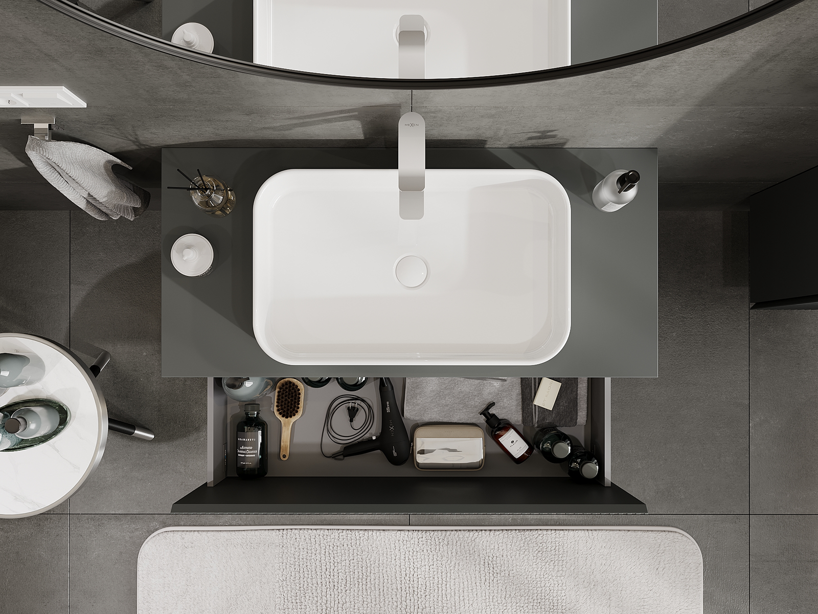 Изрезът в чекмеджето е проектиран по такъв начин, че да побере сифона, който е необходим в мивковите инсталации. Благодарение на това мебелът може да бъде монтиран напълно функционално, без да се налага отказване от пространството в чекмеджето заради инсталацията.