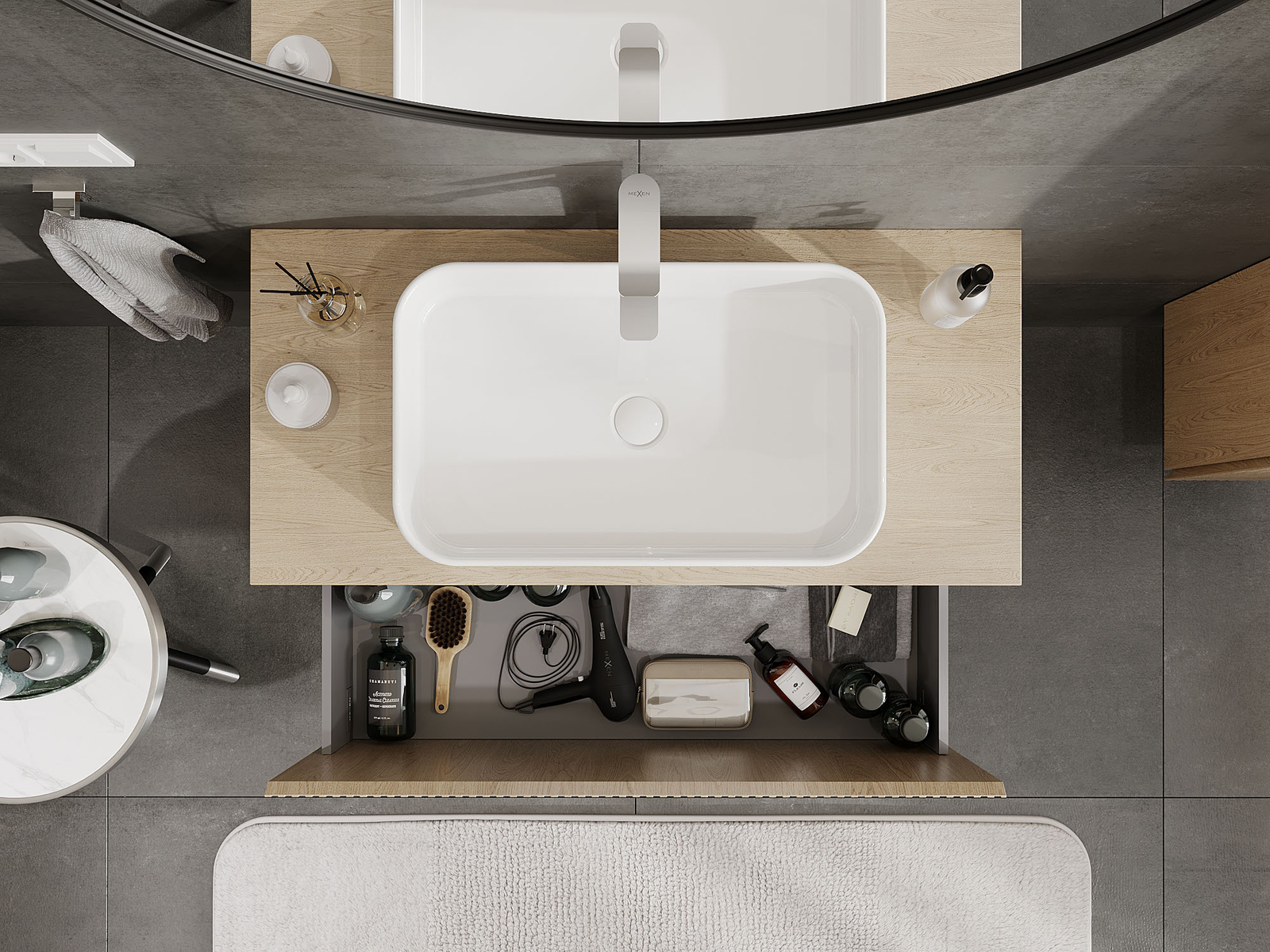 Изрезът в чекмеджето е проектиран по такъв начин, че да побере сифона, който е необходим в мивковите инсталации. Благодарение на това мебелът може да бъде монтиран напълно функционално, без да се налага отказване от пространството в чекмеджето заради инсталацията.