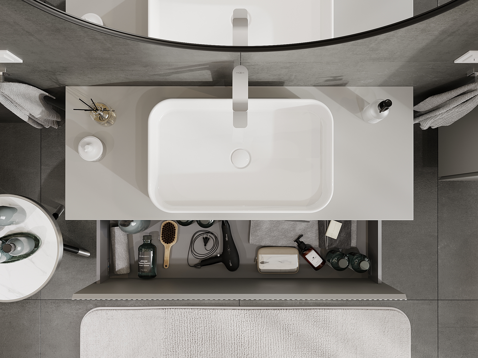 Изрезът в чекмеджето е проектиран по такъв начин, че да побере сифона, който е необходим в мивковите инсталации. Благодарение на това мебелът може да бъде монтиран напълно функционално, без да се налага отказване от пространството в чекмеджето заради инсталацията.
