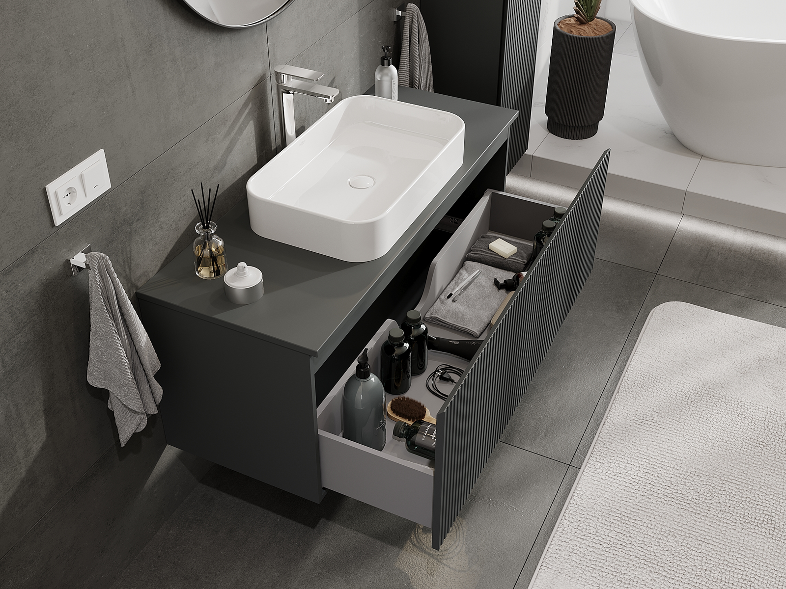 Изрезът в чекмеджето е проектиран по такъв начин, че да побере сифона, който е необходим в мивковите инсталации. Благодарение на това мебелът може да бъде монтиран напълно функционално, без да се налага отказване от пространството в чекмеджето заради инсталацията.