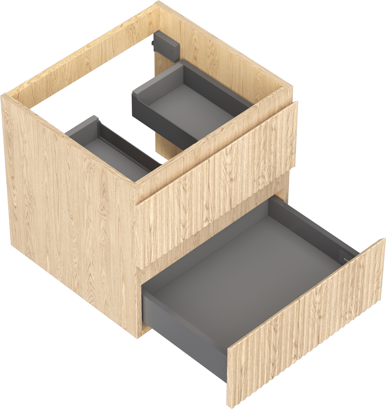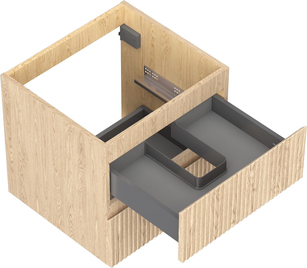 Изрезът в чекмеджето е проектиран по такъв начин, че да побере сифона, който е необходим в мивковите инсталации. Благодарение на това мебелът може да бъде монтиран напълно функционално, без да се налага отказване от пространството в чекмеджето заради инсталацията.