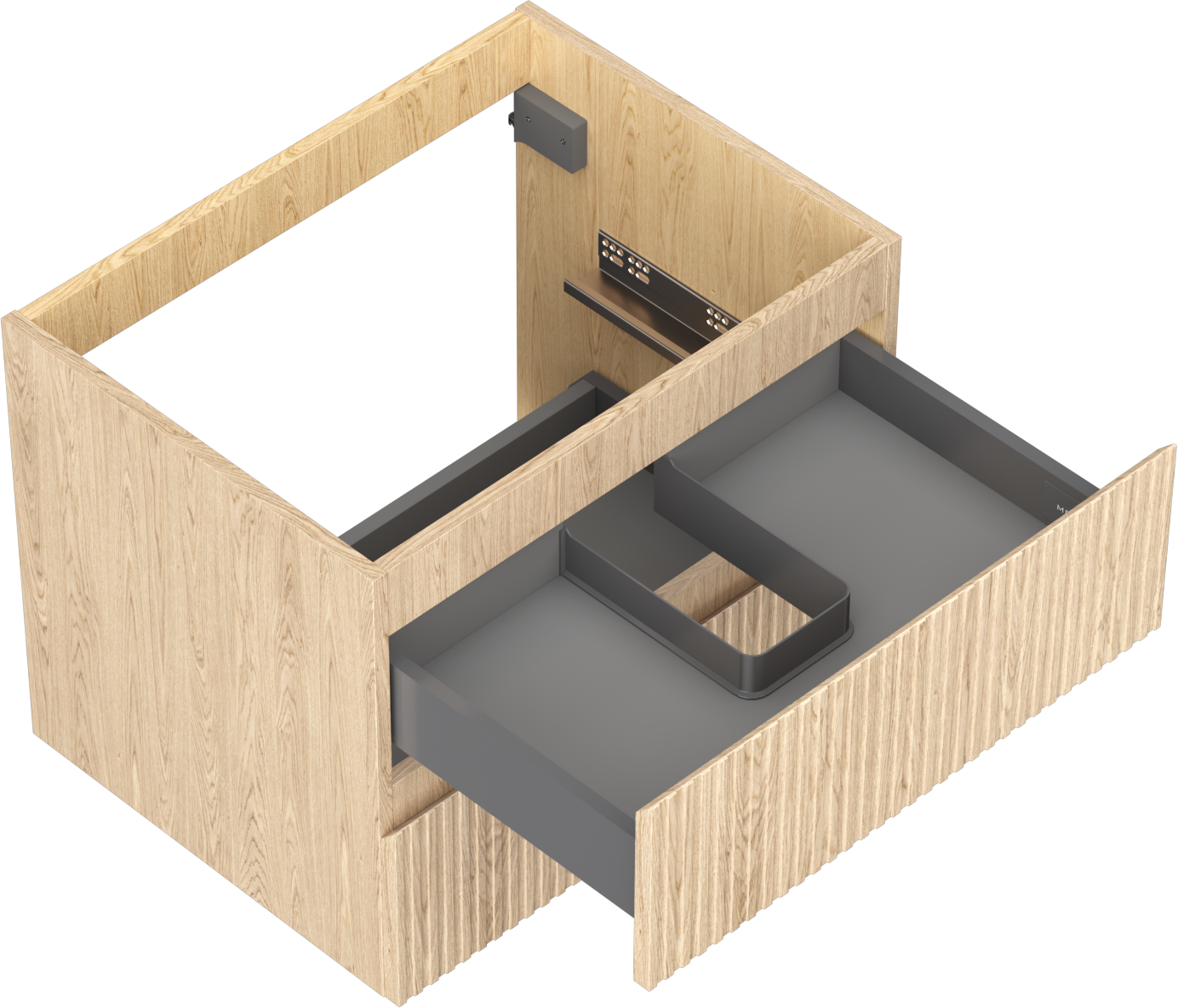 Изрезът в чекмеджето е проектиран по такъв начин, че да побере сифона, който е необходим в мивковите инсталации. Благодарение на това мебелът може да бъде монтиран напълно функционално, без да се налага отказване от пространството в чекмеджето заради инсталацията.