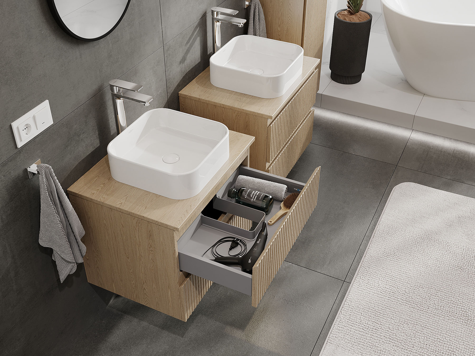 Нашите модулни мебели за баня могат да се комбинират в различни цветови конфигурации, което позволява пълна персонализация. Може да се избере както външният вид, така и функциите на отделните елементи, което позволява съчетаване на мебелите със собствените стилови и функционални предпочитания.