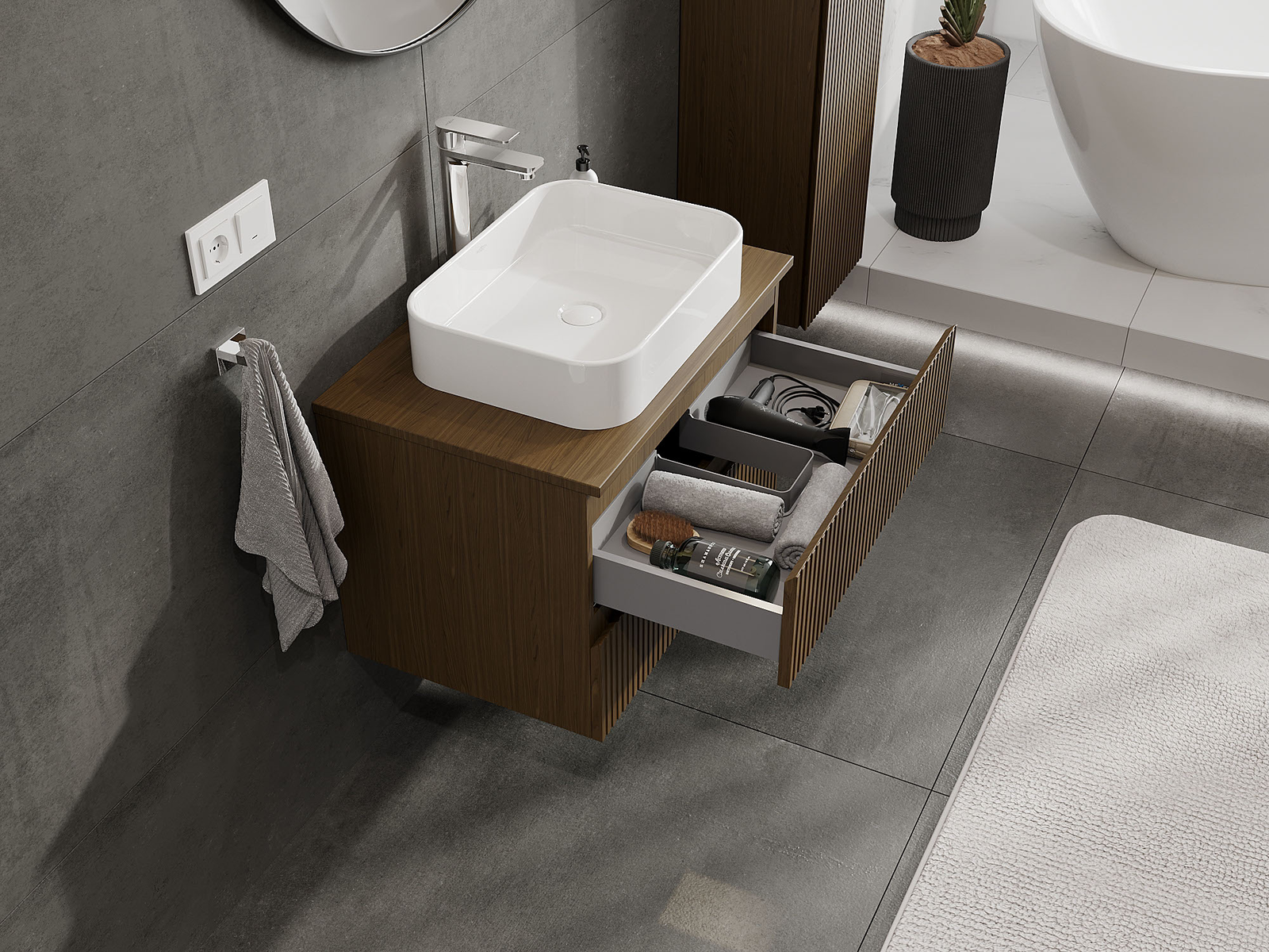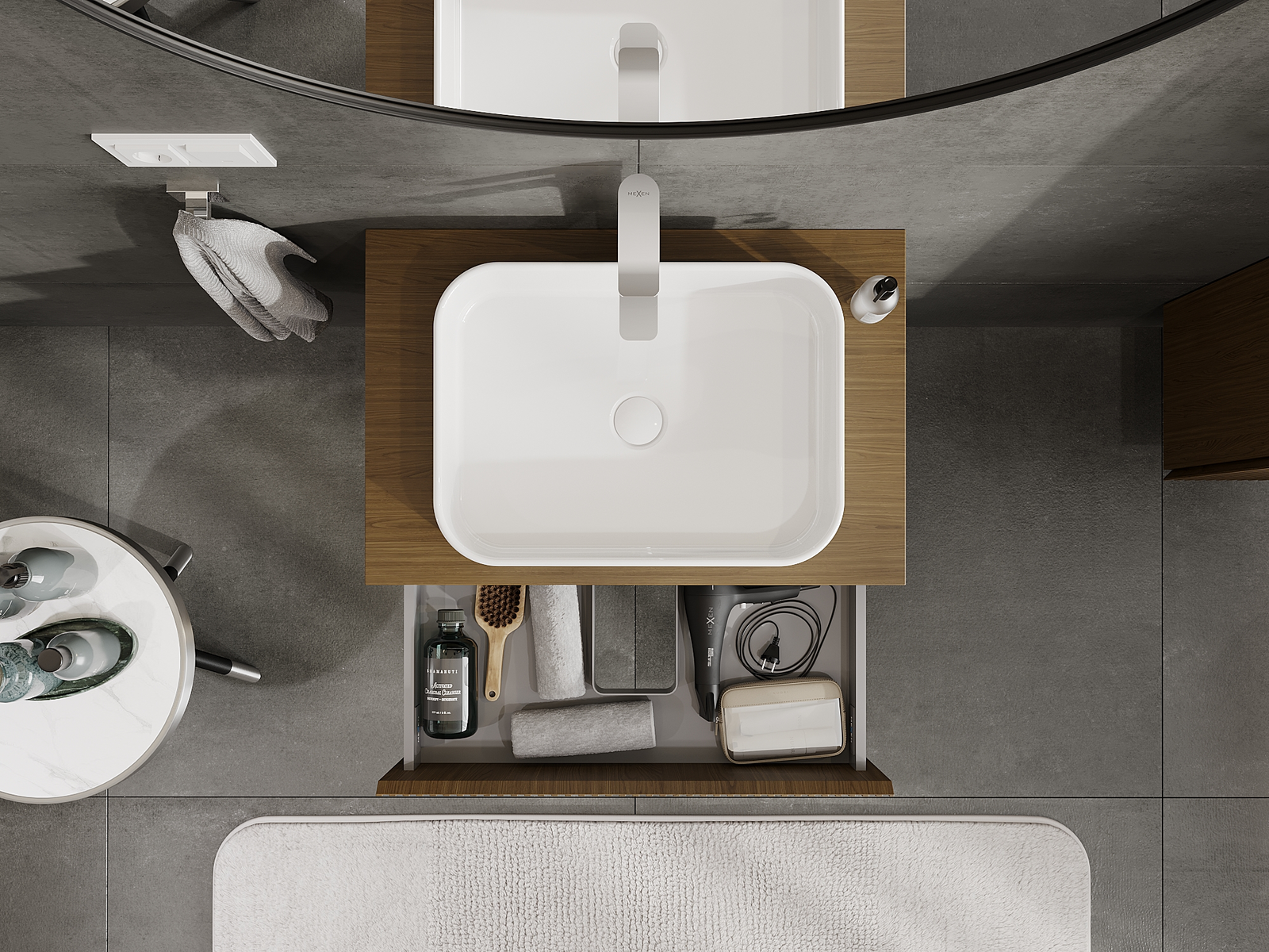 Изрезът в чекмеджето е проектиран по такъв начин, че да побере сифона, който е необходим в мивковите инсталации. Благодарение на това мебелът може да бъде монтиран напълно функционално, без да се налага отказване от пространството в чекмеджето заради инсталацията.
