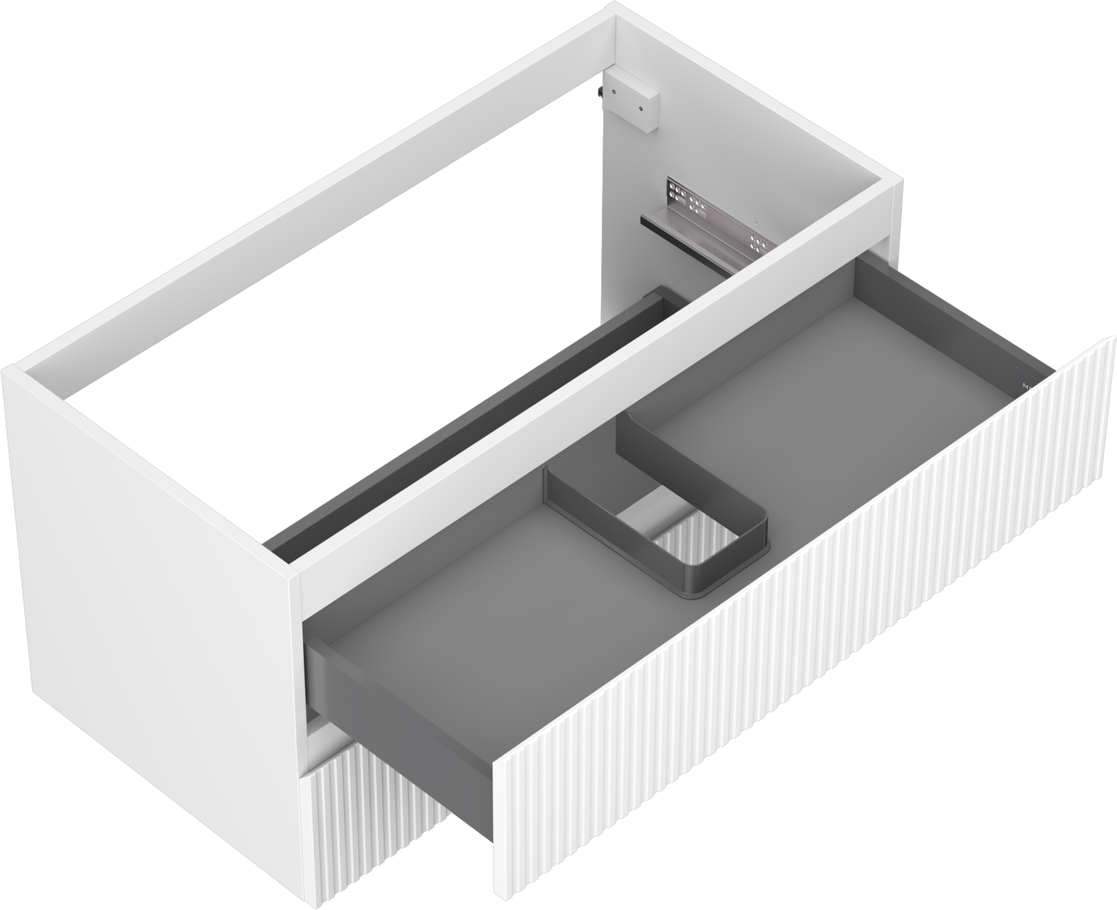 Изрезът в чекмеджето е проектиран по такъв начин, че да побере сифона, който е необходим в мивковите инсталации. Благодарение на това мебелът може да бъде монтиран напълно функционално, без да се налага отказване от пространството в чекмеджето заради инсталацията.
