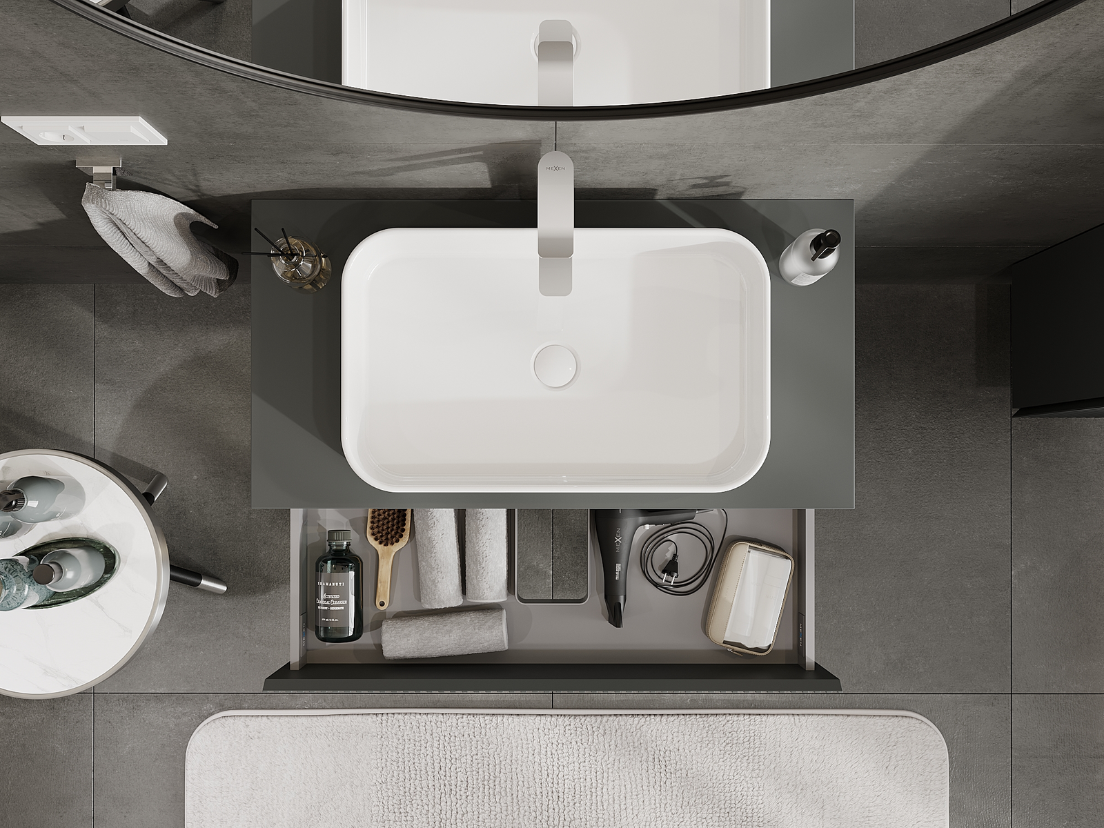 Изрезът в чекмеджето е проектиран по такъв начин, че да побере сифона, който е необходим в мивковите инсталации. Благодарение на това мебелът може да бъде монтиран напълно функционално, без да се налага отказване от пространството в чекмеджето заради инсталацията.