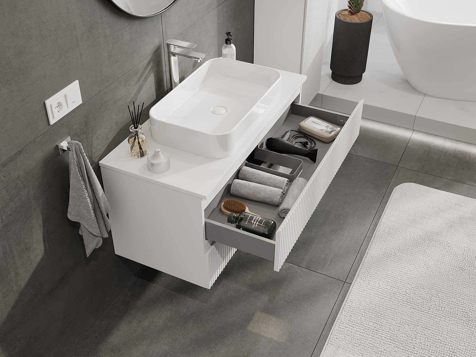 Нашите модулни мебели за баня могат да се комбинират в различни цветови конфигурации, което позволява пълна персонализация. Може да се избере както външният вид, така и функциите на отделните елементи, което позволява съчетаване на мебелите със собствените стилови и функционални предпочитания.