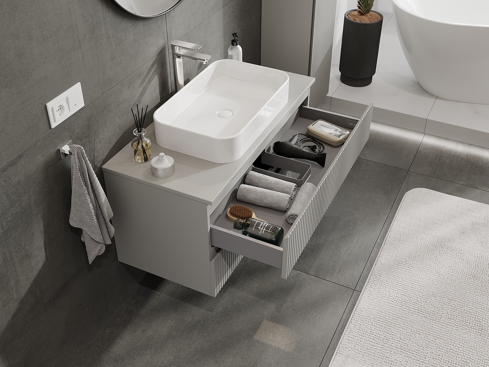Изрезът в чекмеджето е проектиран по такъв начин, че да побере сифона, който е необходим в мивковите инсталации. Благодарение на това мебелът може да бъде монтиран напълно функционално, без да се налага отказване от пространството в чекмеджето заради инсталацията.