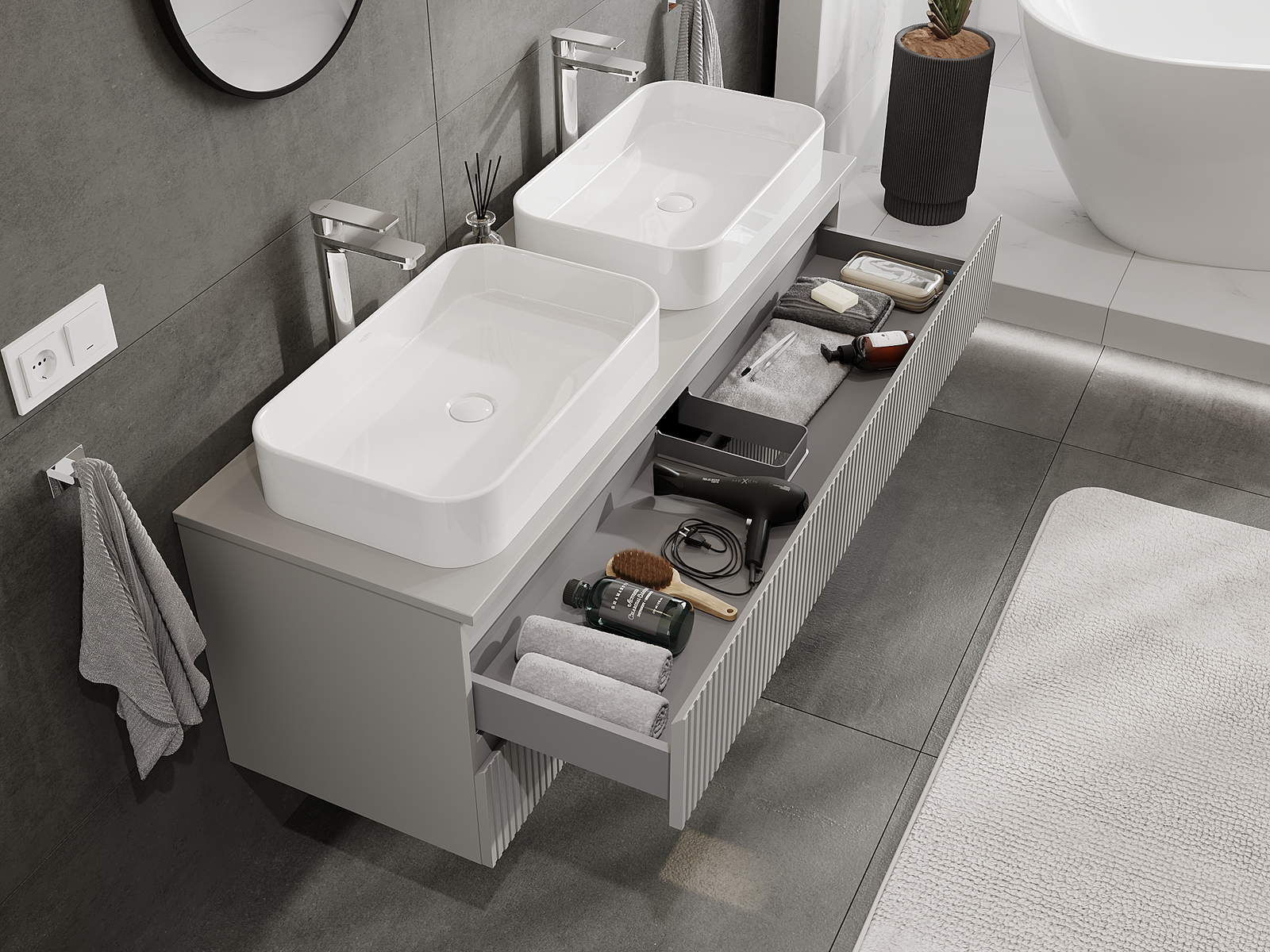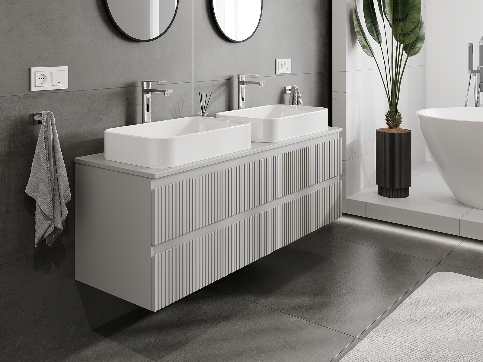 Нашите модулни мебели за баня могат да се комбинират в различни цветови конфигурации, което позволява пълна персонализация. Може да се избере както външният вид, така и функциите на отделните елементи, което позволява съчетаване на мебелите със собствените стилови и функционални предпочитания.