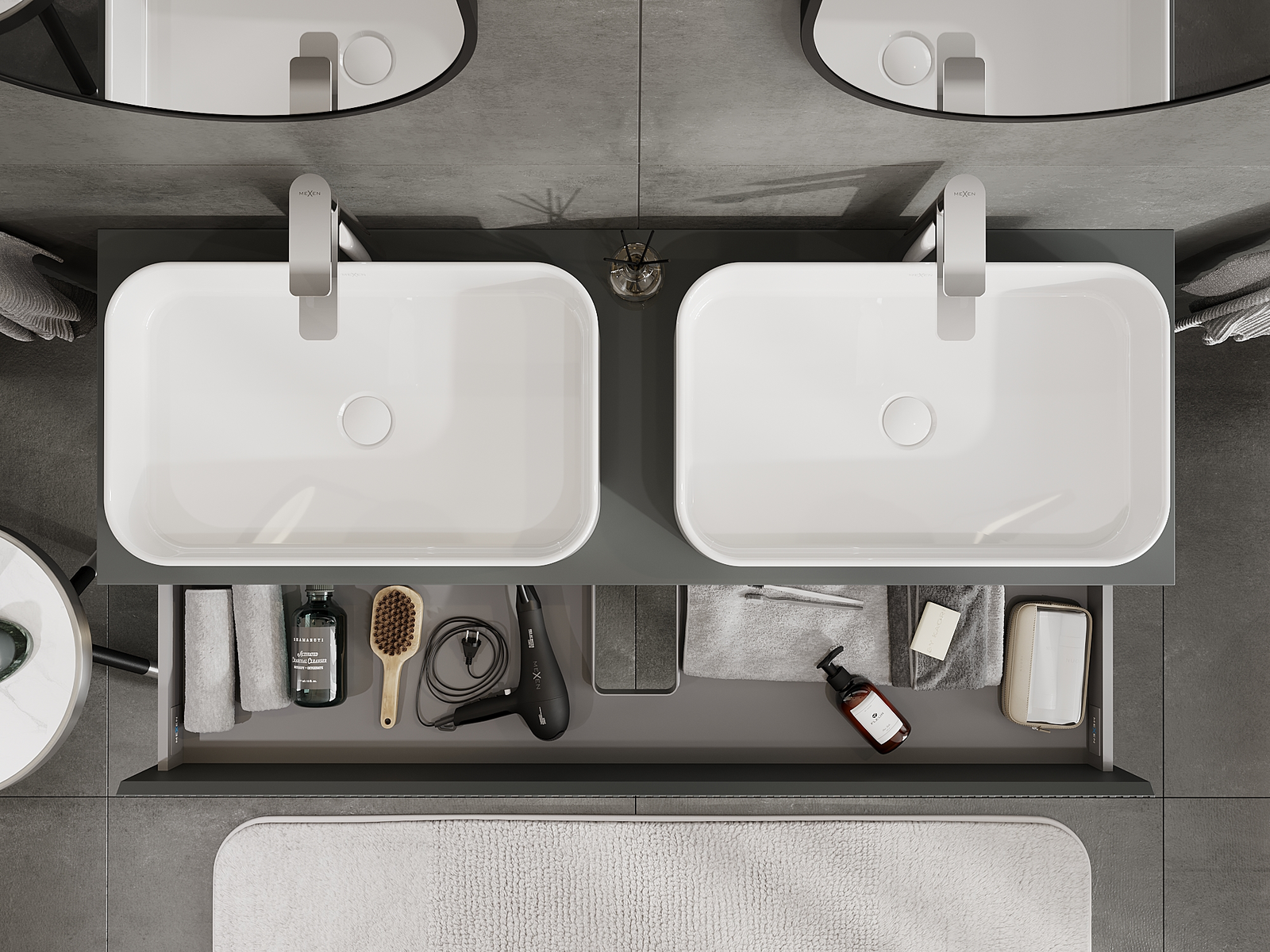 Нашите модулни мебели за баня могат да се комбинират в различни цветови конфигурации, което позволява пълна персонализация. Може да се избере както външният вид, така и функциите на отделните елементи, което позволява съчетаване на мебелите със собствените стилови и функционални предпочитания.