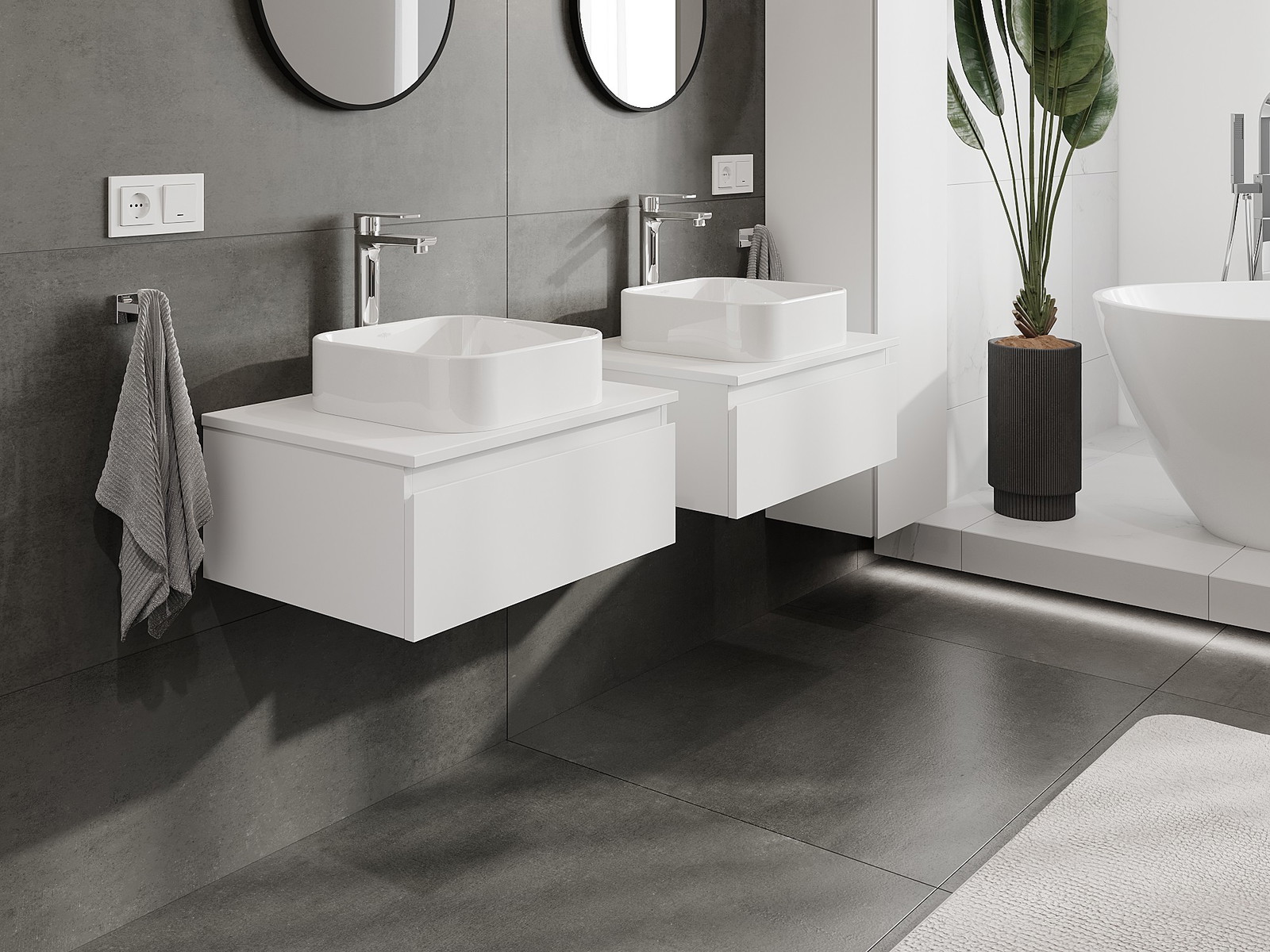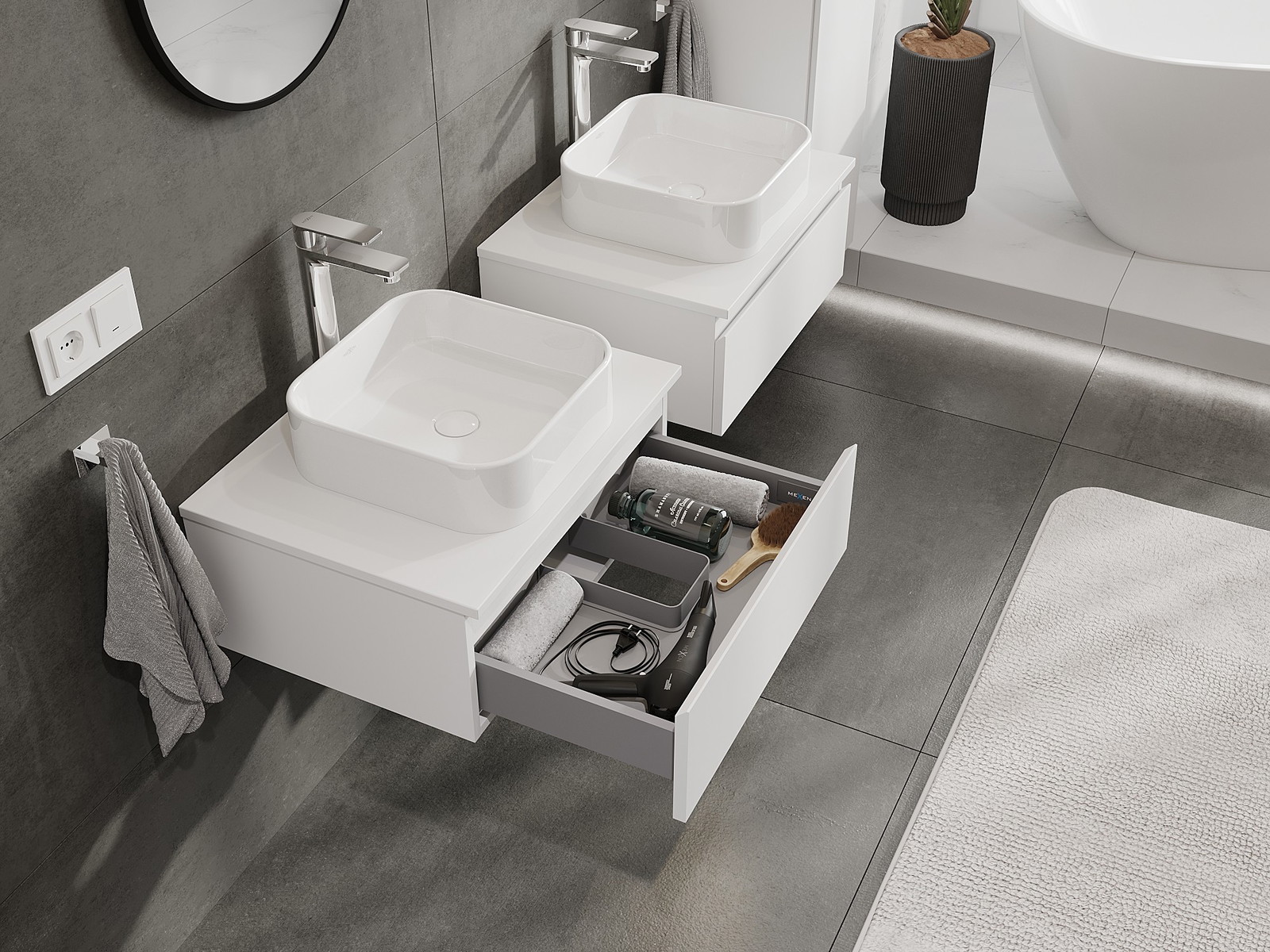 Нашите модулни мебели за баня могат да се комбинират в различни цветови конфигурации, което позволява пълна персонализация. Може да се избере както външният вид, така и функциите на отделните елементи, което позволява съчетаване на мебелите със собствените стилови и функционални предпочитания.