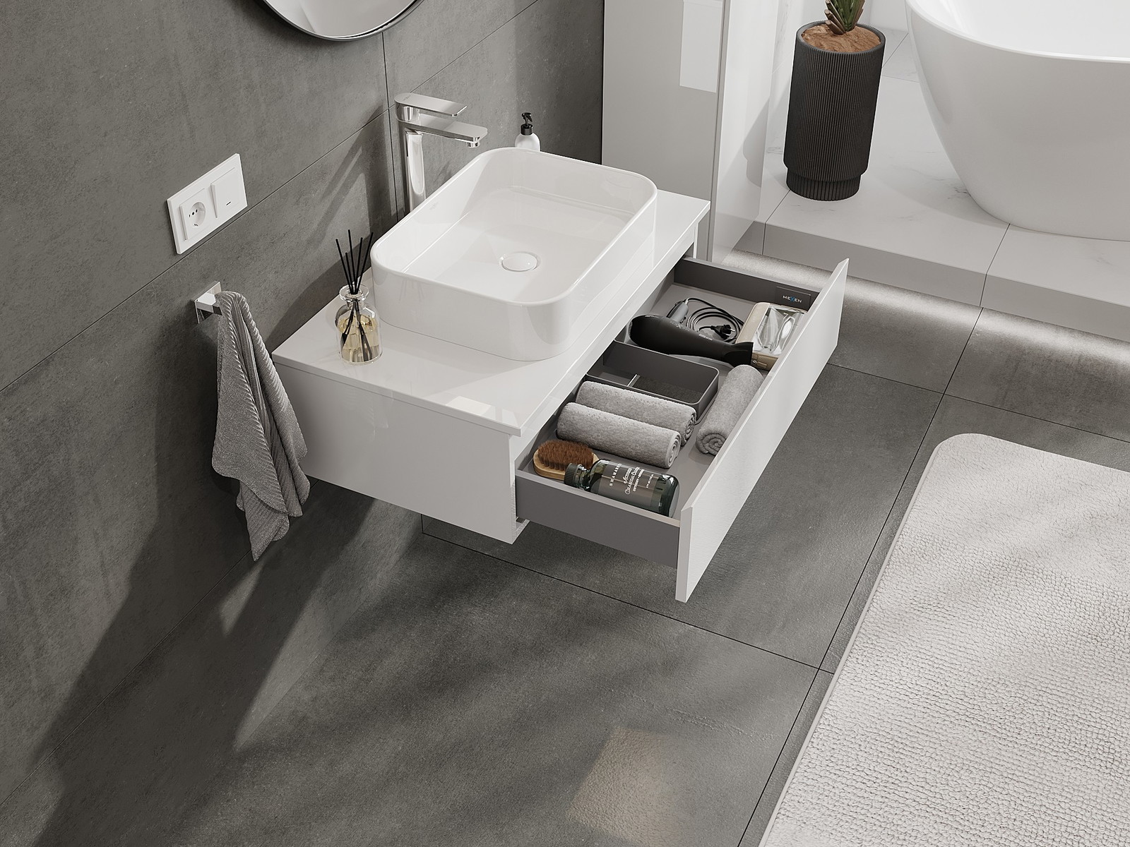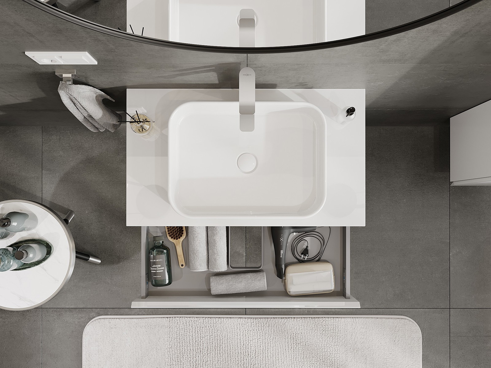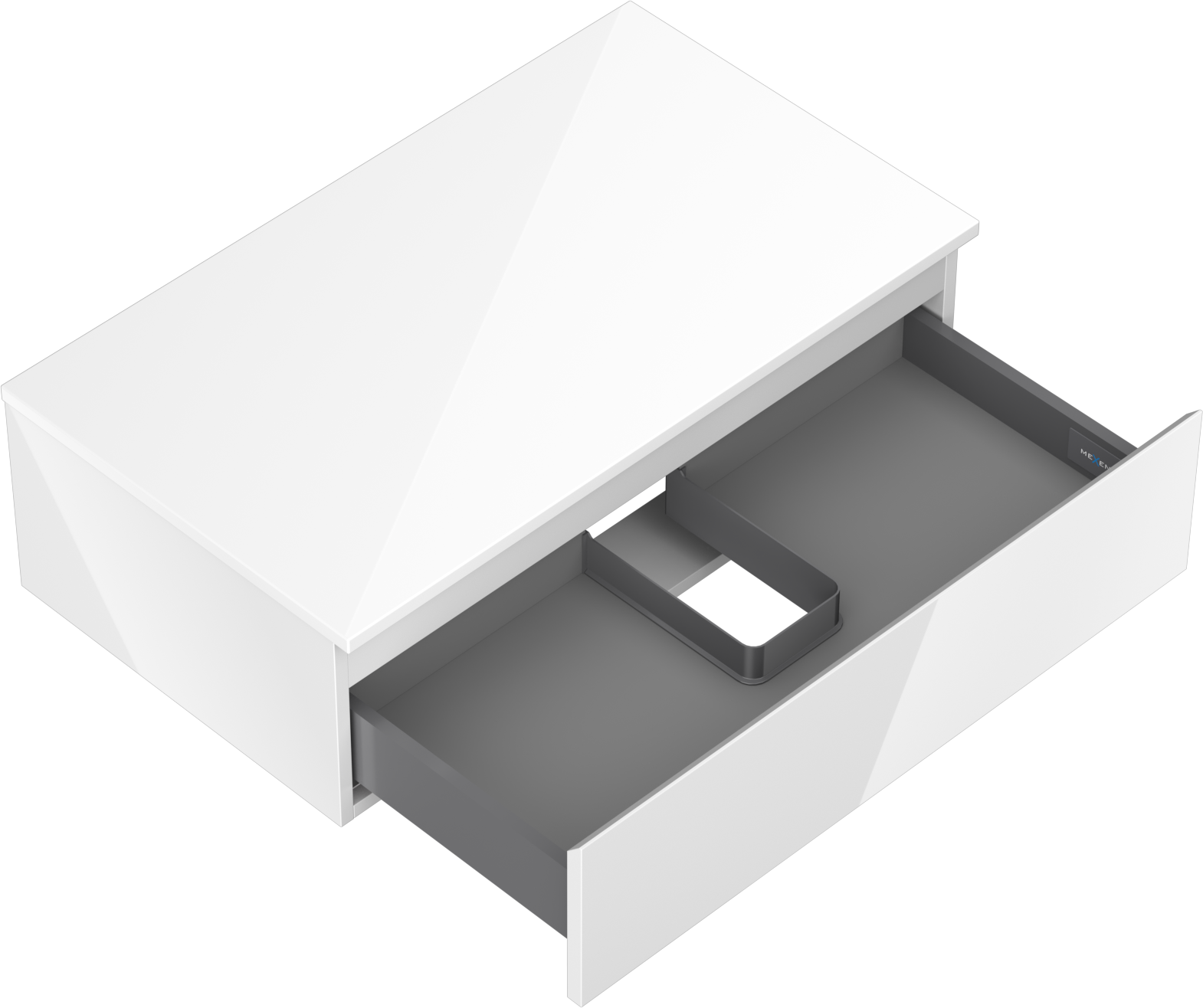 Изрезът в чекмеджето е проектиран по такъв начин, че да побере сифона, който е необходим в мивковите инсталации. Благодарение на това мебелът може да бъде монтиран напълно функционално, без да се налага отказване от пространството в чекмеджето заради инсталацията.
