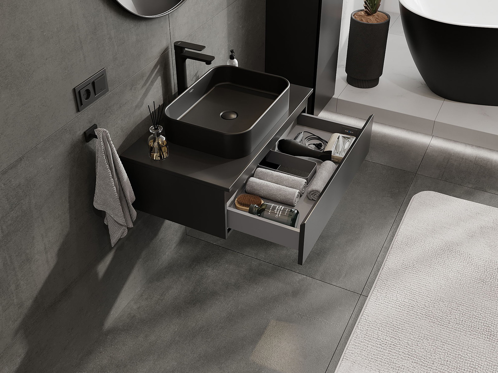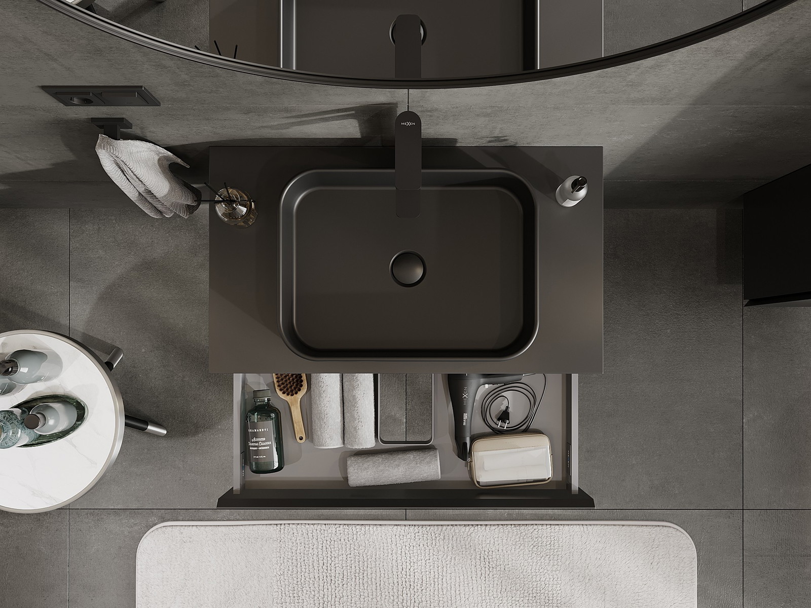 Изрезът в чекмеджето е проектиран по такъв начин, че да побере сифона, който е необходим в мивковите инсталации. Благодарение на това мебелът може да бъде монтиран напълно функционално, без да се налага отказване от пространството в чекмеджето заради инсталацията.